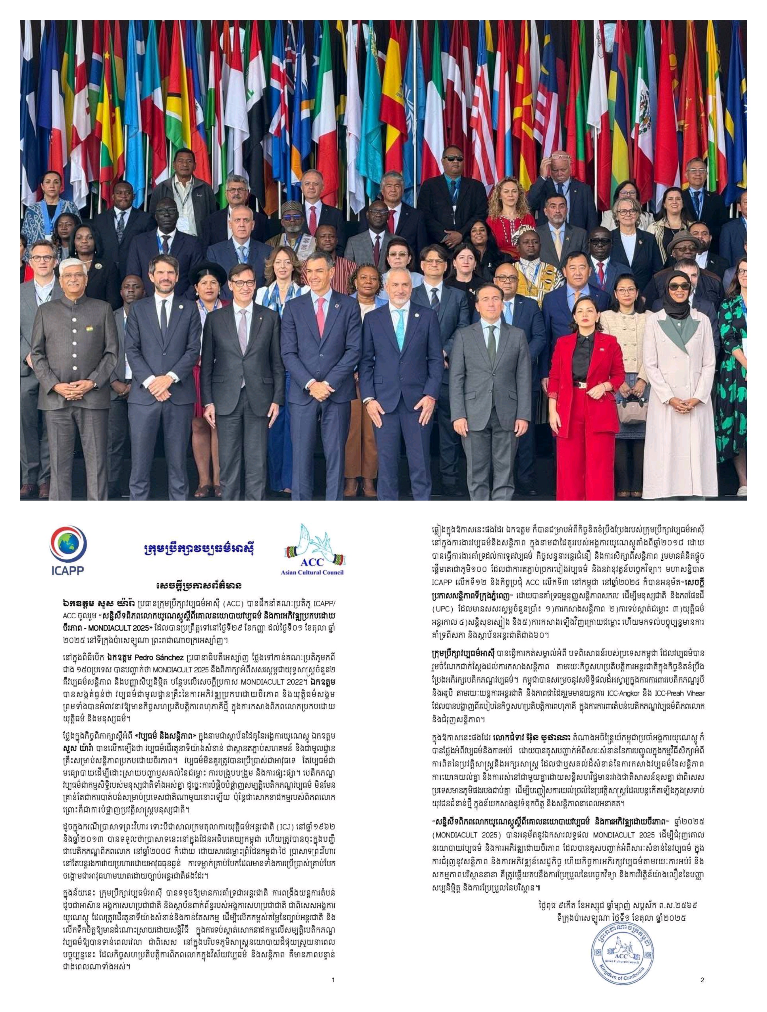 លោក សួស យ៉ារ៉ា ប្រធានក្រុមប្រឹក្សាវប្បធម៌អាស៊ី (ACC) បានថ្លែងដូចនេះនៅក្នុងឱកាសអញ្ជើញដឹកនាំគណៈប្រតិភូ ICAPP/ ACC ចូលរួម «សន្និសីទពិភពលោកយូណេស្កូស្ដីពីគោលនយោបាយវប្បធម៌ និងការអភិវឌ្ឍប្រកបដោយចីរភាព – MONDIACULT 2025» ដែលបានប្រព្រឹត្តទៅនៅថ្ងៃទី២៩ ខែកញ្ញា ដល់ថ្ងៃទី០១ ខែតុលា ឆ្នាំ២០២៥ នៅទីក្រុងប៉ាសេឡូណា ព្រះរាជាណាចក្រអេស្ប៉ាញ។