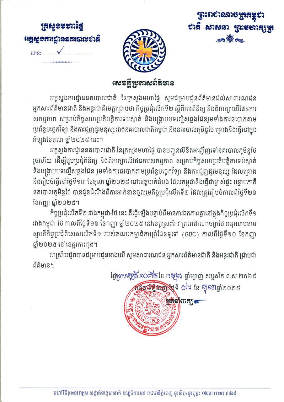 អគ្គស្នងការដ្ឋាននគរបាលជាតិ នៃក្រសួងមហាផ្ទៃ បានបញ្ជូនលិខិតអញ្ជើញទៅនគរបាលភូមិន្ទថៃ រួចហើយ ដើម្បីជួបប្រជុំពិនិត្យ និងពិភាក្សាលើផែនការសកម្មភាព សម្រាប់កិច្ចសហប្រតិបត្តិការទប់ស្កាត់ និងបង្ក្រាបបទល្មើសឆ្លងដែន រួមទាំងការឆបោកតាមប្រព័ន្ធបច្ចេកវិទ្យា និងការជួញដូរមនុស្ស ដែលគ្រោង នឹងរៀបចំធ្វើនៅថ្ងៃទី១៣ ខែតុលា ឆ្នាំ២០២៥ នៅខេត្តបាត់ដំបង ដែលកម្ពុជានឹងធ្វើជាម្ចាស់ផ្ទះ បន្ទាប់ភាគី នគរបាលភូមិន្ទថៃ បានជូនដំណឹងពីការអាក់ខានចូលរួមកិច្ចប្រជុំលើកទី២ ដែលត្រូវរៀបចំកាលពីថ្ងៃទី២៦ ខែកញ្ញា ឆ្នាំ២០២៥។