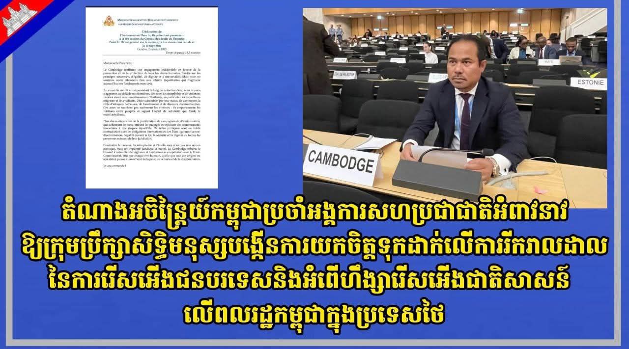 ភ្នំពេញ : យោងតាមការបង្ហោះផ្សាយក្នុងបណ្តាញសង្គមរបស់តំណាងអចិន្ត្រៃយ៍កម្ពុជាប្រចាំអង្គការសហប្រជាជាតិ នៅព្រឹកថ្ងៃទី៣ ខែតុលា ឆ្នាំ២០២៥ បានឱ្យដឹងថា នៅព្រឹកថ្ងៃទី២ ខែតុលា ឆ្នាំ២០២៥ នៅក្នុងសម័យប្រជុំលើកទី៦០ នៃក្រុមប្រឹក្សាសិទ្ធិមនុស្ស ឯកឧត្តម ឯកអគ្គរាជទូត អ៊ិន តារា តំណាងអចិន្ត្រៃយ៍កម្ពុជា ប្រចាំអង្គការសហប្រជាជាតិ នៅទីក្រុងហ្សឺណែវ បានថ្លែងបទអន្តរាគមន៍ក្នុងអំឡុងកិច្ចពិភាក្សាទូទៅ ក្នុងរបៀបវារៈទី៩ ស្តីពីការប្រកាន់ជាតិសាសន៍ ការរើសអើងពូជសាសន៍ និងការរើសអើងជនបរទេស។