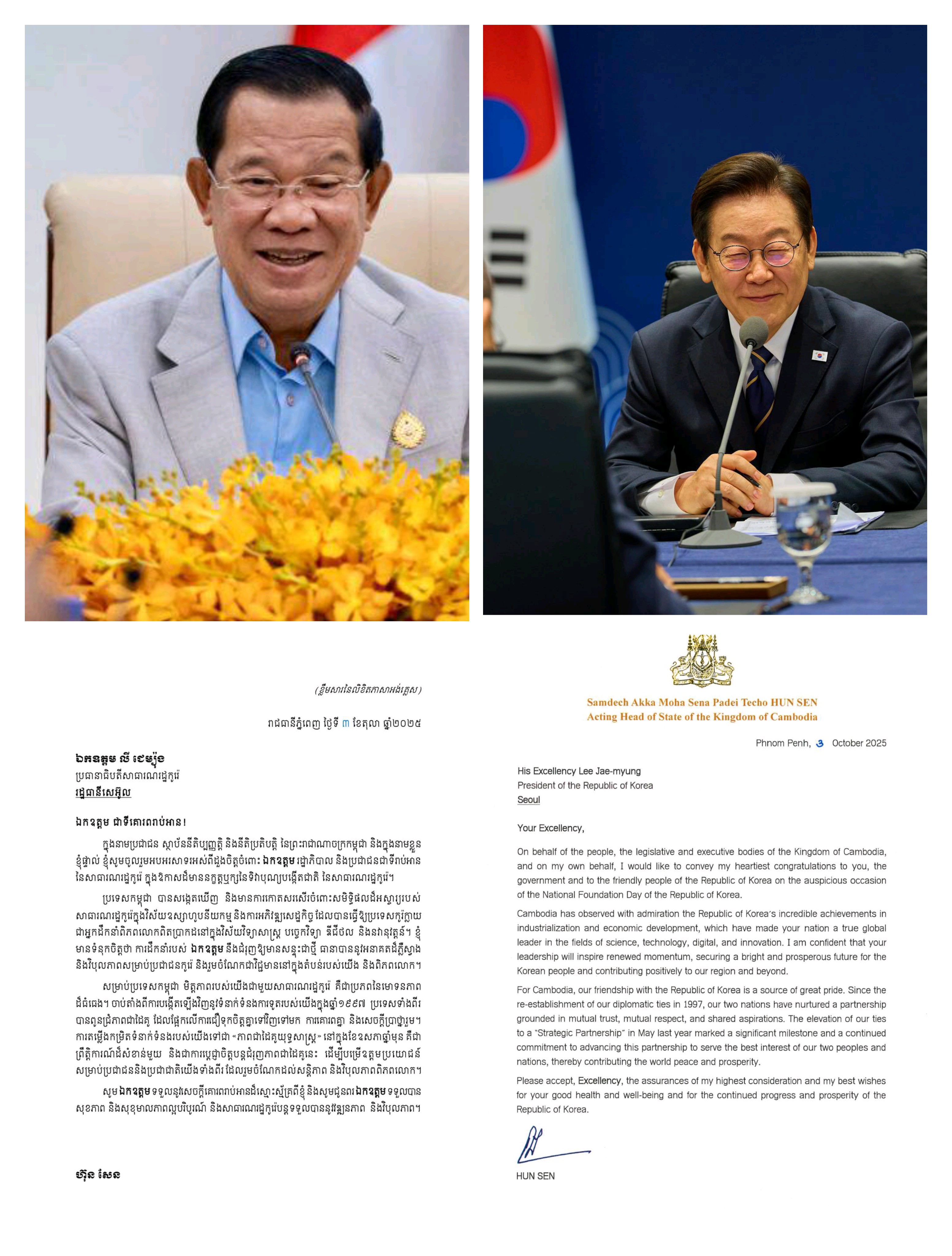 តាមរយៈសារលិខិតផ្ញើជូនដល់ប្រធានាធិបតីកូរ៉េ លោក លី ជេម្យ៉ុង កាលពីថ្ងៃទី៣ ខែតុលា ឆ្នាំ២០២៥ម្សិលមិញនេះ ក្នុងឱកាសទិវាបុណ្យបង្កើតជាតិ នៃសាធារណរដ្ឋកូរ៉េ សម្តេចតេជោ ហ៊ុន សែន បានមានប្រសាសន៍ថា ក្នុងនាមប្រជាជន ស្ថាប័ននីតិប្បញ្ញត្តិ និងនីតិប្រតិបត្តិ នៃព្រះរាជាណាចក្រកម្ពុជា និងក្នុងនាមសម្តេចផ្ទាល់ សម្តេចសូមចូលរួមអបអរសាទរអស់ពីដួងចិត្តចំពោះឯកឧត្តម ប្រធានាធិបតី រដ្ឋាភិបាល និងប្រជាជនជាទីរាប់អាននៃសាធារណរដ្ឋកូរ៉េ ក្នុងឱកាសដ៏មាននក្ខត្តឬក្សនៃទិវាបុណ្យបង្កើតជាតិ នៃសាធារណរដ្ឋកូរ៉េ។