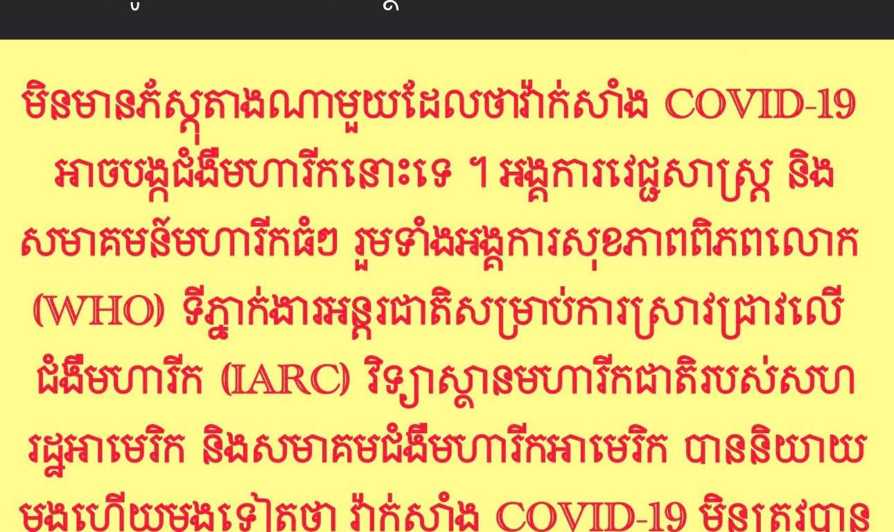 គួរបញ្ជាក់ថា កន្លងមកនេះនាយកដ្ឋានប្រយុទ្ធនឹងជំងឺឆ្លង បានបញ្ជាក់ថា គិតត្រឹមថ្ងៃទី១ តុលា ២០២៥ អង្គការសុខភាពពិភពលោក (WHO) មិនទាន់រកឃេីញថា ការចាក់វ៉ាក់សាំងកូវីដ១៩ អាចបង្កជំងឺមហារីកនោះទេ !