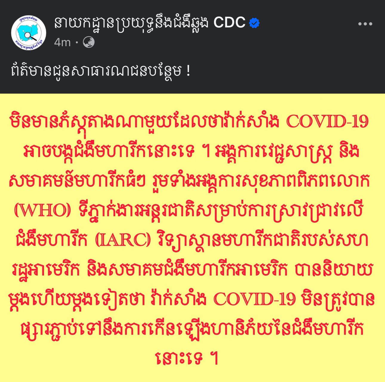 ភ្នំពេញ៖ នាយកដ្ឋានប្រយុទ្ធនឹងជំងឺឆ្លង នៃក្រសួងសុខាភិបាលកម្ពុជា នៅព្រឹកថ្ងៃសៅរ៍ទី០៤ ខែតុលា ឆ្នាំ២០២៥ បានឱ្យដឹងថា ព័ត៌មានជូនសាធារណជនបន្ថែម! មិនមានភ័ស្តុតាងណាមួយដែលថាវ៉ាក់សាំង COVID-19 អាចបង្កជំងឺមហារីកនោះទេ ។