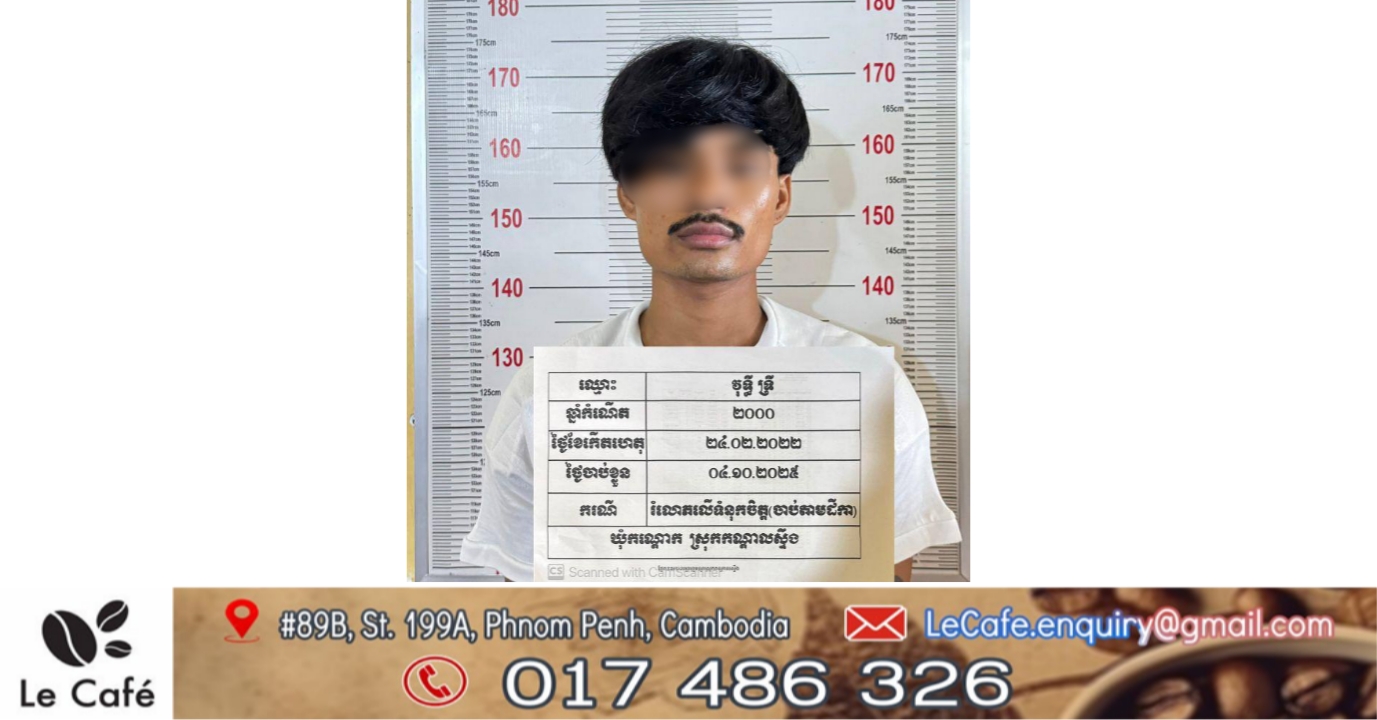 ខេត្តកណ្ដាល៖ ជនត្រូវចោទម្នាក់ ត្រូវបាននគរបាលចាប់ខ្លួន ដោយអនុវត្តតាមដីការបស់សាលាដំបូងខេត្តកណ្ដាល ។ ប្រតិបត្តិការចាប់ខ្លួននេះ ធ្វើឡើងនៅថ្ងៃ​ទី​៥ ខែតុលា ឆ្នាំ​២០២៥ ចំណុច:ភូមិ​ ទឹកនឹម ឃុំ​កណ្ដោក ស្រុក​ កណ្ដាល​ស្ទឹង​ ខេត្ត​កណ្ដាល​