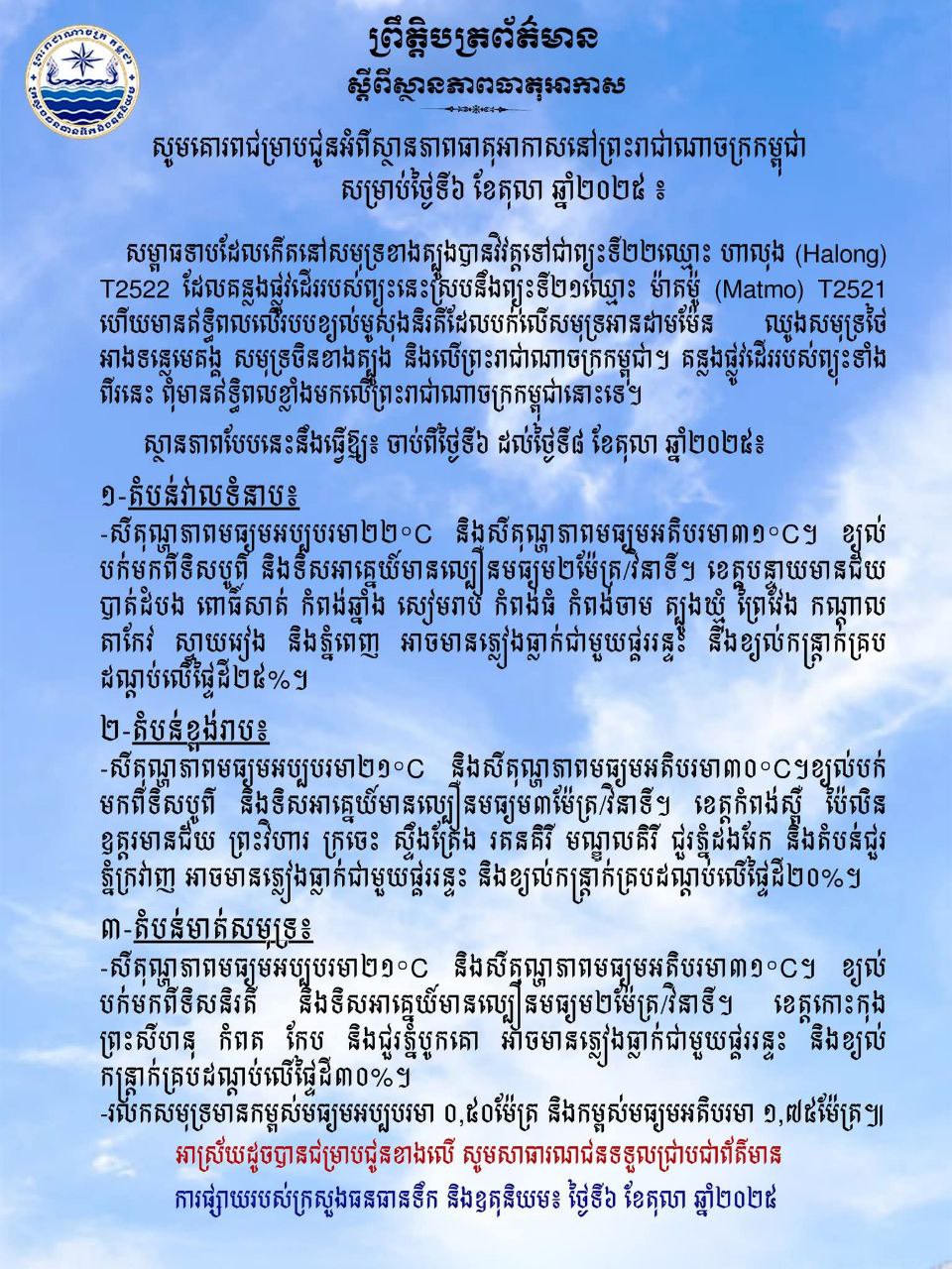 សូមគោរពជម្រាបជូនអំពីស្ថានភាពធាតុអាកាសនៅព្រះរាជាណាចក្រកម្ពុជា សម្រាប់ថ្ងៃទី៦ ខែតុលា ឆ្នាំ២០២៥ ៖
