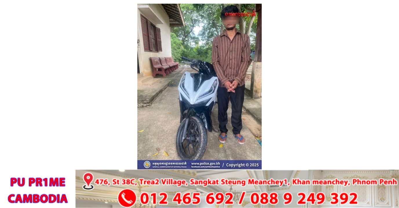 ខេត្តពោធិ៍សាត់៖ អនុវត្តតាមបទបញ្ជានាយឧត្តម សេនីយ៍ ស ថេត អគ្គស្នងការនគរបាលជាតិ និងការយកចិត្តទុកដាក់ណែនាំចង្អុលបង្ហាញពី លោកឧត្តម សេនីយ៍ទោ ស ថេង ស្នងការនគរបាលខេត្តពោធិ៍សាត់ កាលពីថ្ងៃទី៥ ខែតុលា ឆ្នាំ២០២៥ វេលាម៉ោង៨និង ២០នាទី មានឈ្មោះ ឆែ ចាន់ហេង ភេទប្រុស អាយុ ៣៨ឆ្នាំ មុខរបរលក់ដូរ រស់នៅភូមិក្បាល ស្ពានថ្ម សង្កាត់ព្រៃញី ក្រុងពោធិ៍សាត់ ខេត្តពោធិ៍សាត់ បានមកដាក់ពាក្យបណ្តឹងថា កាលពីថ្ងៃទី១ខែតុលា ឆ្នាំ២០២៥ វេលាម៉ោង១៤និង០០នាទី ឈ្មោះ កង វិត ភេទប្រុស អាយុ ២៥ឆ្នាំ មុខរបរមិនពិតប្រាកដ រស់នៅភូមិប្រឡាយធំ ឃុំវាល ស្រុកកណ្ដៀង ខេត្តពោធិ៍សាត់ បានខ្ចីម៉ូតូជាកម្ម សិទ្ធិរបស់ខ្លួន ម៉ាកហុងដាឃ្លីក(Click)ពណ៌ស គ្មានស្លាកលេខ ថាជិះទៅមើលភ្លើង ពេលនោះខ្លួនក៏បានអោយខ្ចីម៉ូតូជាកម្មសិទ្ធិ ជិះទៅបាត់ដំណឹងរហូតដល់បច្ចុប្បន្ន។