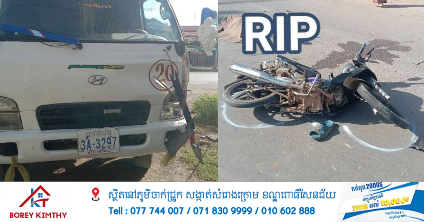 ខេត្តបាត់ដំបង៖ បុរសម្នាក់ត្រូវបានរថយន្តធុនធំដឹកទឹកកកពោធិ៍វាលបុកពីក្រោយបណ្តាលឱ្យស្លាប់ភ្លាមៗខណៈកំពុងជិះម៉ូតូបម្រុងបត់ឆ្លងផ្លូវនៅវេលាម៉ោង០៧ និង៤០នាទី ថ្ងៃទី០៦ ខែតុលា ឆ្នាំ២០២៥ នៅតាមបណ្តោយផ្លូវជាតិលេខ៥ ស្ថិតក្នុងក្រុមទី០៨ ភូមិអន្លង់វិល ឃុំអន្លង់វិល ស្រុកសង្កែ ខេត្តបាត់ដំបង ។