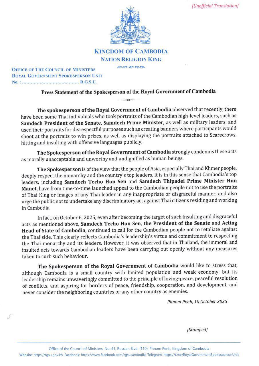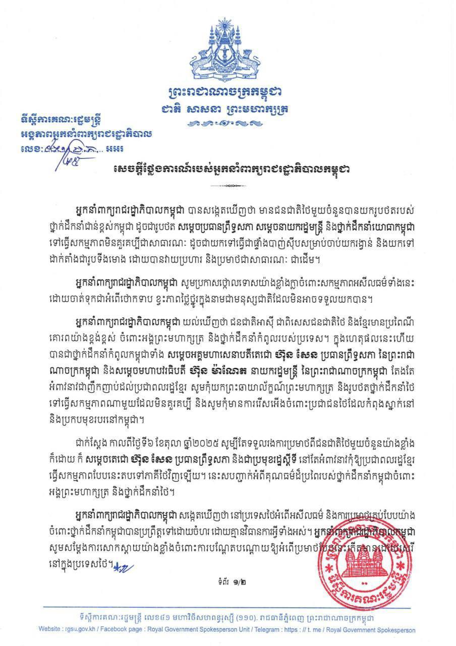 ជាមួយគ្នានេះ អ្នកនាំពាក្យរាជរដ្ឋាភិបាលកម្ពុជា សូមប្រកាសថ្កោលទោសយ៉ាងខ្លាំងក្លាចំពោះសកម្មភាពអសីលធម៌របស់ជនជាតិថៃមួយចំនួន ដែលបានយករូបថតរបស់ថ្នាក់ដឹកនាំជាន់ខ្ពស់កម្ពុជា ទៅធ្វើសកម្មភាពមិនគួរគប្បីជាសាធារណៈ ដោយចាត់ទុកទង្វើនេះជាអំពើថោកទាប និងខ្វះភាពថ្លៃថ្នូរក្នុងនាមជាមនុស្សជាតិ ដែលមិនអាចទទួលយកបាន៕