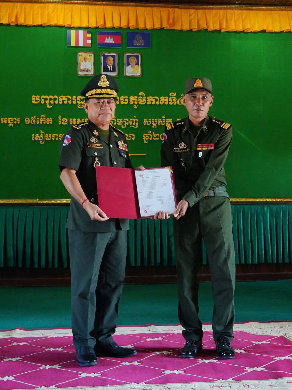 ខេត្តសៀមរាប ៖ នៅថ្ងៃទី០៧ ខែតុលា ឆ្នាំ២០២៥ លោកឧត្តមសេនីយ៍ឯក ពៅ ហេង មេបញ្ជាការរងកងទ័ពជើងគោក មេបញ្ជាការយោធភូមិភាគទី៤ អញ្ជើញជាអធិបតីក្នុងពិធីប្រគល់សេចក្តីសម្រេចផ្លាស់ប្តូរមុខងារតួនាទី ភារកិច្ច និងបំពាក់ឋានន្តរសក្តិជូនដល់ នាយទាហានចំនួន ១៨០រូប ចំណុះឲ្យយោធភូមិភាគទី៤ នៅបញ្ជាការដ្ឋានយោធភូមិភាគទី៤ ។