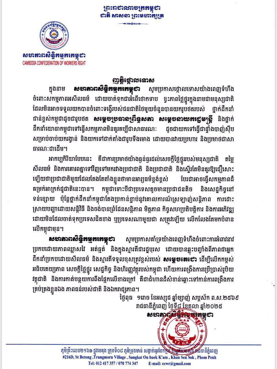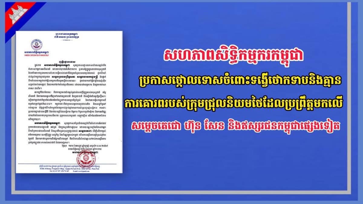 ភ្នំពេញ ៖ នៅថ្ងៃទី៨ ខែតុលាឆ្នាំ២០២៥ សហភាពសិទ្ធិកម្មករកម្ពុជា បានចេញញត្តិប្រកាសថ្កោលទោសយ៉ាងពេញទំហឹងចំពោះសកម្មភាពអសីលធម៌ ដោយចាត់ទុកជាអំពើថោកទាប ខ្វះភាពថ្លៃថ្នូរក្នុងនាមជាមនុស្សជាតិដែលមិនអាចទទួលយកបានចំពោះទង្វើរបស់ជនជាតិថៃមួយចំនួនបានយករូបថតរបស់ ថ្នាក់ដឹកនាំជាន់ខ្ពស់កម្ពុជាដូចជារូបថត សម្ដេចប្រធានព្រឹទ្ធសភា សម្តេចនាយករដ្ឋមន្តី និងថ្នាក់ដូចជាយកទៅធ្វើជាផ្ទាំងបាញ់ស៊ីបសម្រាប់ចាប់យករង្វាន់ និងយកទៅដាក់តាំងជារូបទីងមោង ដោយបានវាយប្រហារ និងប្រមាថជាសាធារណៈជាដើម។