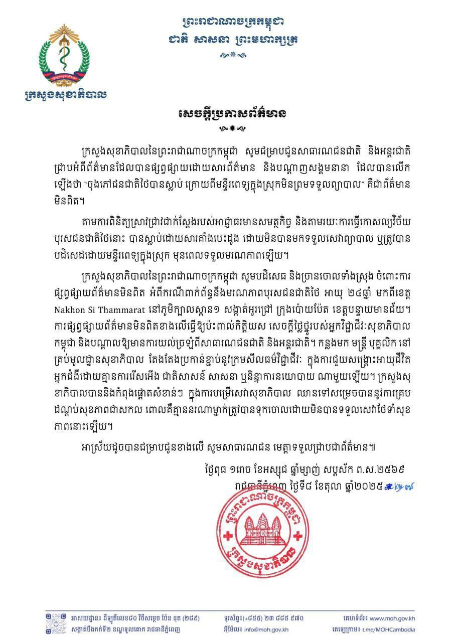 ភ្នំពេញ៖ ក្រសួងសុខាភិបាលនៃព្រះរាជាណាចក្រកម្ពុជា នៅថ្ងៃទី០៨ ខែតុលា ឆ្នាំ២០២៥នេះ សូមជម្រាបជូនសាធារណជនជាតិ និងអន្តរជាតិ ជ្រាបអំពីព័ត៌មានដែលបានផ្សព្វផ្សាយដោយសារព័ត៌មាន និងបណ្តាញសង្គមនានា ដែលបានលើក ឡើងថា “ចុងភៅជនជាតិថៃបានស្លាប់ ក្រោយពីមន្ទីរពេទ្យក្នុងស្រុកមិនព្រមទទួលព្យាបាល” គឺជាព័ត៌មាន មិនពិត។