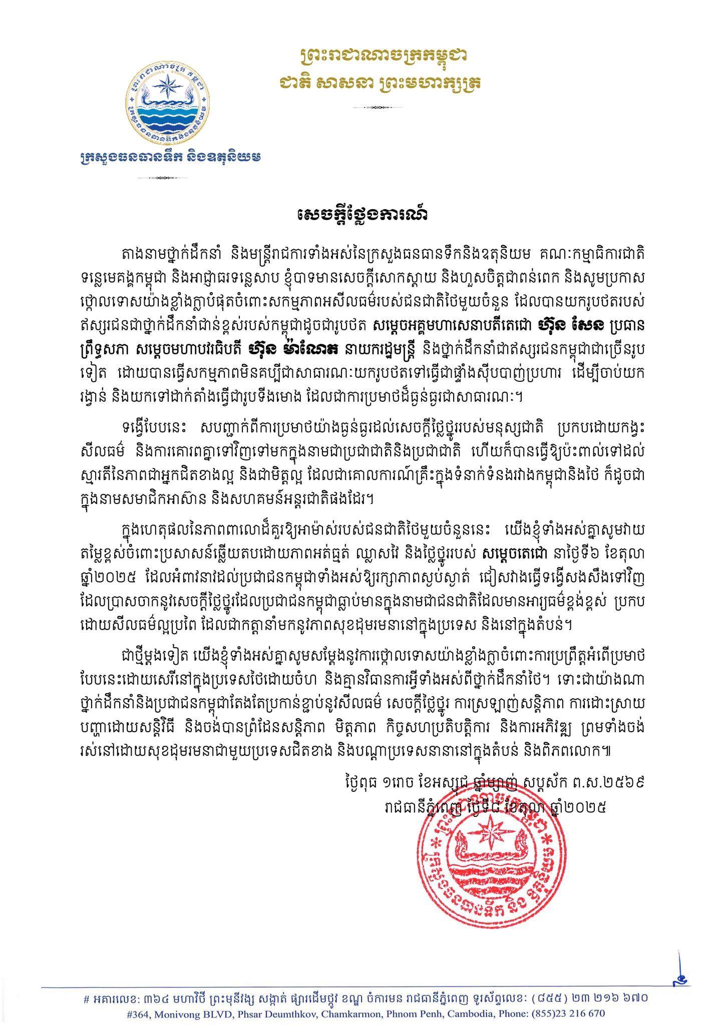 ក្នុងហេតុផលនៃភាពពាលោដ៏គួរឱ្យអាម៉ាស់របស់ជនជាតិថៃមួយចំនួននេះ យើងខ្ញុំទាំងអស់គ្នាសូមវាយ តម្លៃខ្ពស់ចំពោះប្រសាសន៍ឆ្លើយតបដោយភាពអត់ធ្មត់ ឈ្លាសវៃ និងថ្លៃថ្នូររបស់ សម្តេចតេជោ នាថ្ងៃទី៦ ខែតុលា ឆ្នាំ២០២៥ ដែលអំពាវនាវដល់ប្រជាជនកម្ពុជាទាំងអស់ឱ្យរក្សាភាពស្ងប់ស្ងាត់ ជៀសវាងធ្វើទង្វើសងសឹងទៅវិញ ដែលប្រាសចាកនូវសេចក្តីថ្លៃថ្នូរដែលប្រជាជនកម្ពុជាធ្លាប់មានក្នុងនាមជាជនជាតិដែលមានអារ្យធម៌ខ្ពង់ខ្ពស់ ប្រកប ដោយសីលធម៌ល្អប្រពៃ ដែលជាកត្តានាំមកនូវភាពសុខដុមរមនានៅក្នុងប្រទេស និងនៅក្នុងតំបន់។