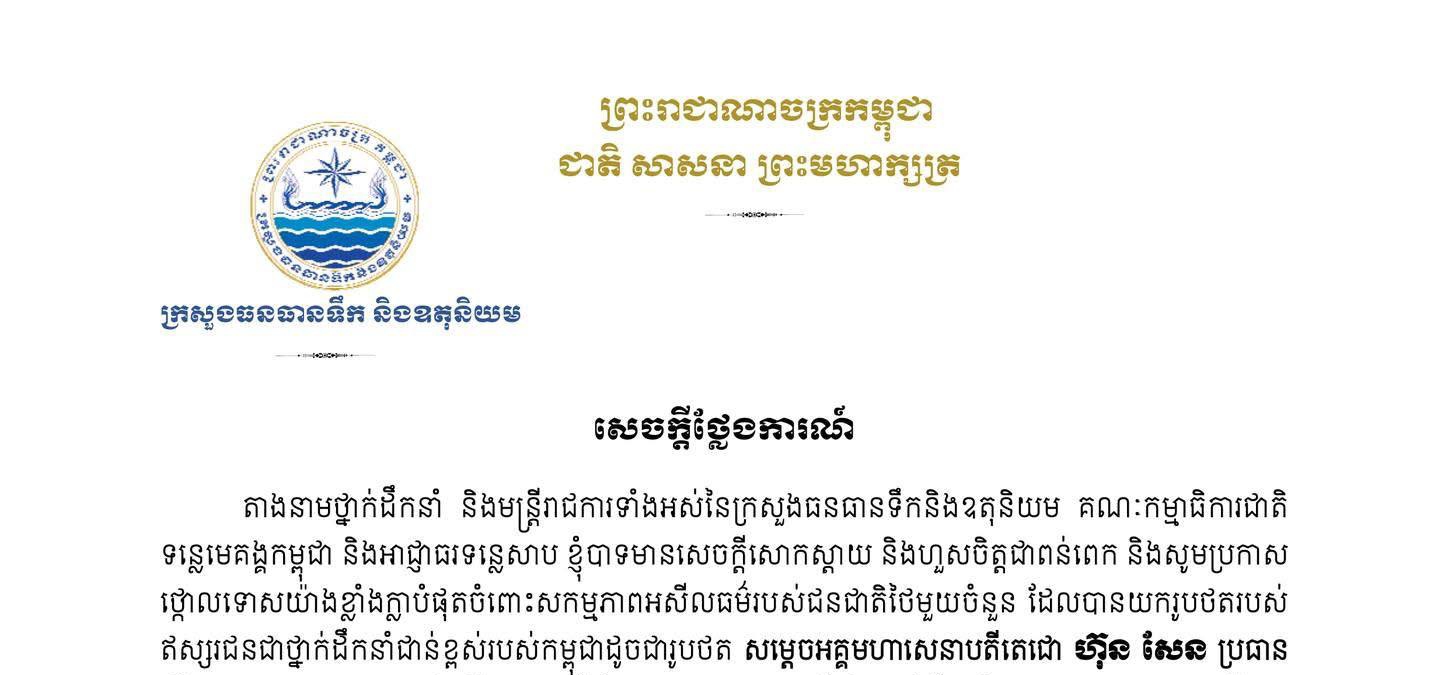 ភ្នំពេញ៖ តាងនាមថ្នាក់ដឹកនាំ និងមន្ត្រីរាជការទាំងអស់នៃក្រសួងធនធានទឹកនិងឧតុនិយម គណៈកម្មាធិការជាតិ ទន្លេមេគង្គកម្ពុជា និងអាជ្ញាធរទន្លេសាប មានសេចក្តីសោកស្តាយ និងហួសចិត្តជាពន់ពេក និងសូមប្រកាស ថ្កោលទោសយ៉ាងខ្លាំងក្លាបំផុតចំពោះសកម្មភាពអសីលធម៌របស់ជនជាតិថៃមួយចំនួន ដែលបានយករូបថតរបស់ ឥស្សរជនជាថ្នាក់ដឹកនាំជាន់ខ្ពស់របស់កម្ពុជាដូចជារូបថត សម្តេចអគ្គមហាសេនាបតីតេជោ ហ៊ុន សែន ប្រធាន ព្រឹទ្ធសភា សម្តេចមហាបវរធិបតី ហ៊ុន ម៉ាណែត នាយករដ្ឋមន្ត្រី និងថ្នាក់ដឹកនាំជាឥស្សរជនកម្ពុជាជាច្រើនរូប ទៀត ដោយបានធ្វើសកម្មភាពមិនគប្បីជាសាធារណៈយករូបថតទៅធ្វើជាផ្ទាំងស៊ីបបាញ់ប្រហារ ដើម្បីចាប់យក រង្វាន់ និងយកទៅដាក់តាំងធ្វើជារូបទីងមោង ដែលជាការប្រមាថដ៏ធ្ងន់ធ្ងរជាសាធារណៈ។