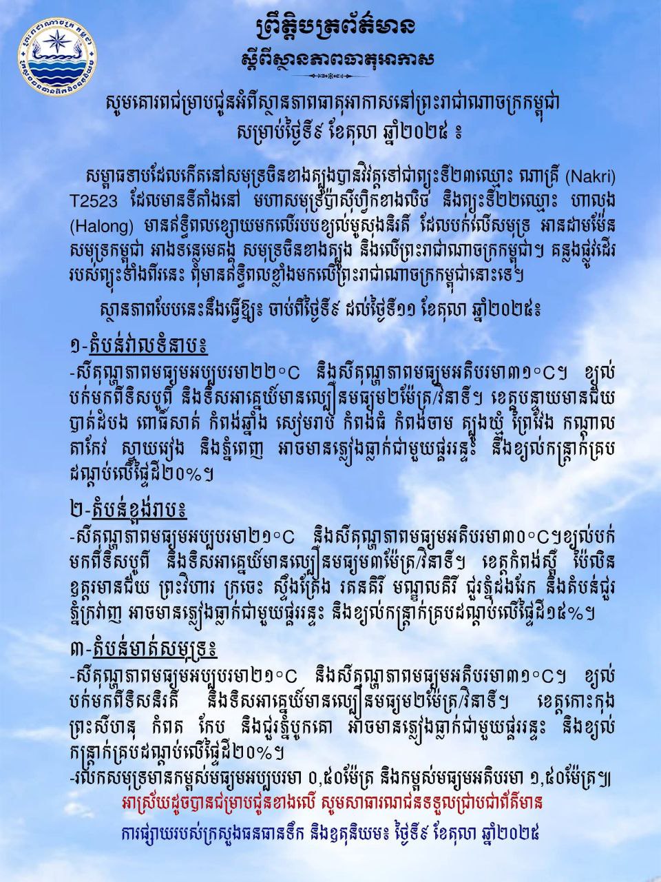 សូមគោរពជម្រាបជូនអំពីស្ថានភាពធាតុអាកាសនៅព្រះរាជាណាចក្រកម្ពុជា សម្រាប់ថ្ងៃទី៩ ខែតុលា ឆ្នាំ២០២៥ ៖