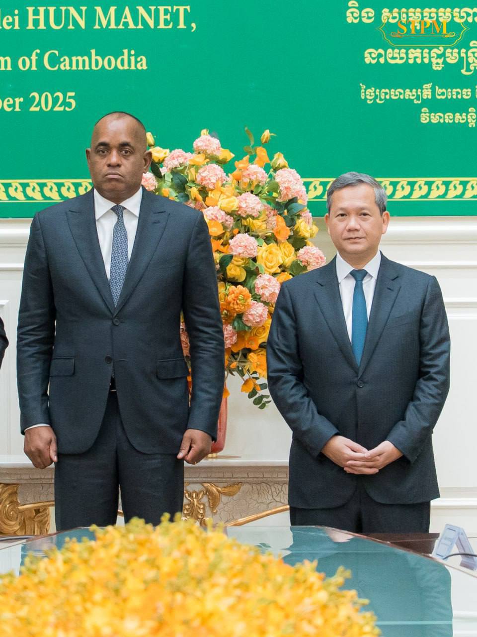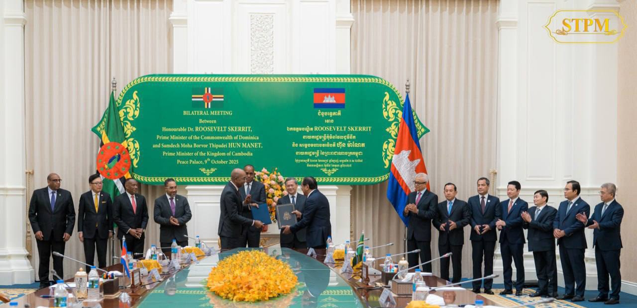 ភ្នំពេញ៖ សម្ដេចមហាបវរធិបតី ហ៊ុន ម៉ាណែត នាយករដ្ឋមន្ត្រីកម្ពុជា នៅព្រឹកថ្ងៃព្រហស្បតិ៍ ទី៩ ខែតុលា ឆ្នាំ២០២៥ បានអញ្ជើញចូលរួមជាអធិបតីភាពជាមួយ លោលបណ្ឌិត Roosevelt Skerrit នាយករដ្ឋមន្ត្រីនៃកុំមិនវែលដូមីនីក ក្នុងពិធីផ្លាស់ប្តូរអនុស្សារណៈនៃការយោគយល់គ្នា ស្តីពីការបង្កើតកិច្ចពិគ្រោះយោបល់ទ្វេភាគី រវាងក្រសួងការបរទេសនៃប្រទេសទាំងពីរ។