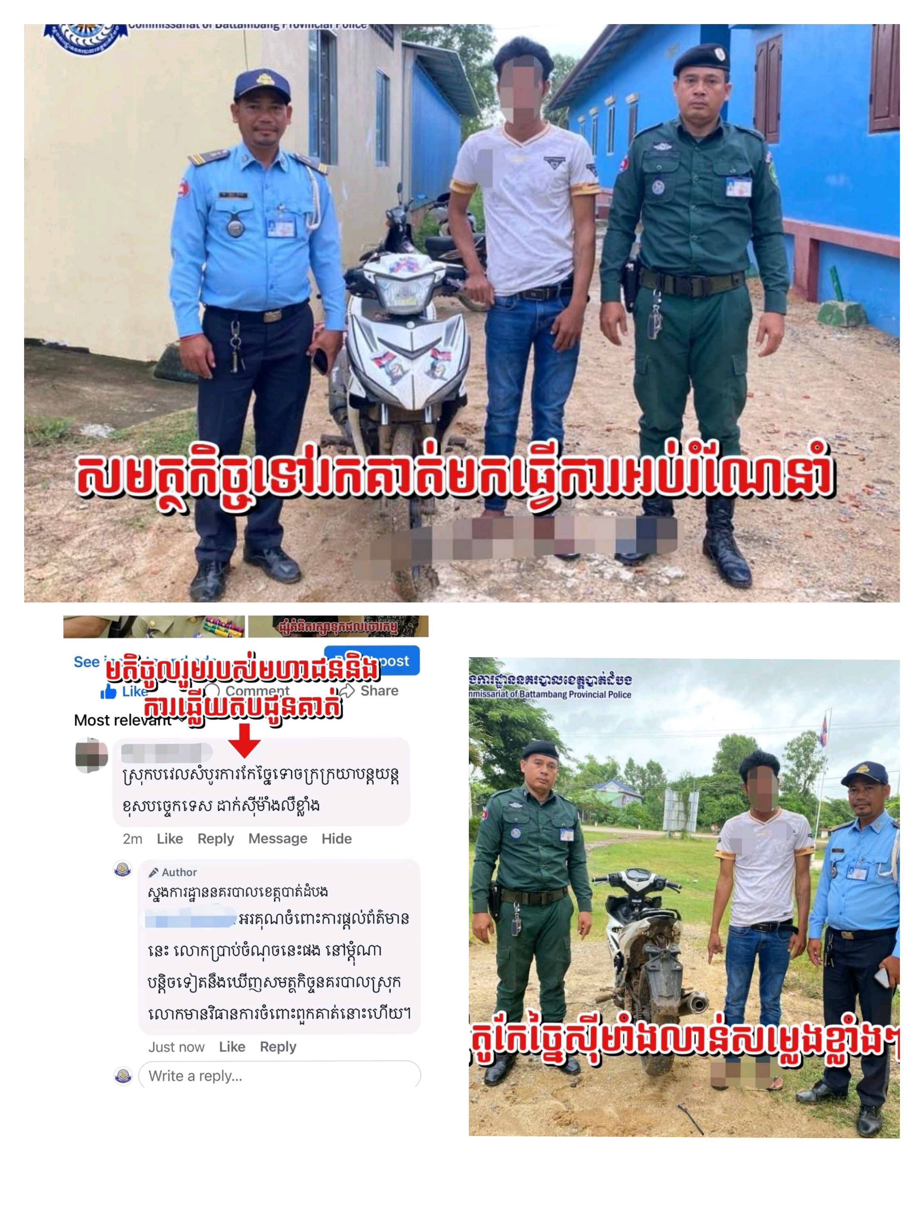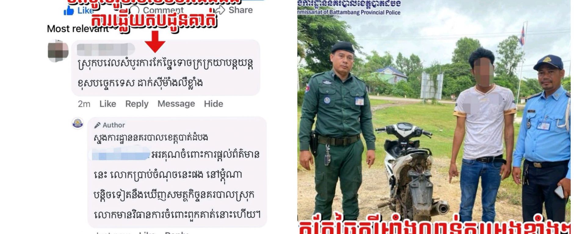 ខេត្តបាត់ដំបង÷ ក្រុមការងារព័ត៌មាននិងប្រតិកម្មរហ័ស នៃស្នងការដ្ឋាននគរបាលខេត្តបាត់ សូមជម្រាបជូនសាធារណជនបានជ្រាបថាកាលពីថ្ងៃទី ៨ ខែ តុលា ឆ្នាំ ២០២៥ ក្នុងពេលដែលក្រុមការងារផ្សព្វផ្សាយព័ត៌មានក្នុងផេកហ្វេសប៊ុកផ្លូវការរបស់ស្នងការដ្ឋាន មហាជនលោក បានចូលរួមជាមតិយោបល់ចំពោះករណី អ្នកប្រេីប្រាសម៉ូតូកែច្នៃបំពង់ស៊ីម៉ាំងលាន់សម្លេងខ្លាំងៗបង្កការ