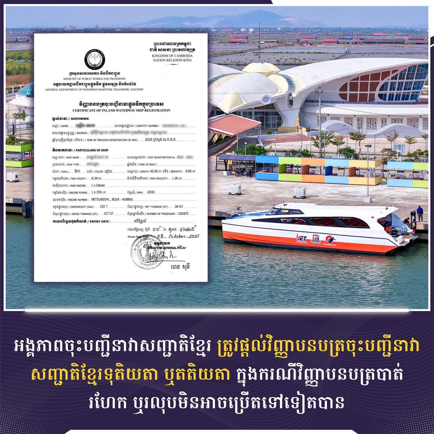 ភ្នំពេញ៖ ក្រសួងសាធារណការ និងដឹកជញ្ជូន នៅរសៀលថ្ងៃទី០៩ ខែតុលា ឆ្នាំ២០២៥នេះ បានឱ្យដឹងថា អង្គភាពចុះបញ្ជីនាវាសញ្ជាតិខ្មែរ ត្រូវផ្តល់វិញ្ញាបនបត្រចុះបញ្ជីនាវាសញ្ជាតិខ្មែរទុតិយតា ឬតតិយតា ក្នុងករណីវិញ្ញាបនបត្រចុះបញ្ជីនាវាសញ្ជាតិខ្មែរ បានបាត់ រហែក ឬរលុបមិនអាចប្រើតទៅទៀតបាន។
