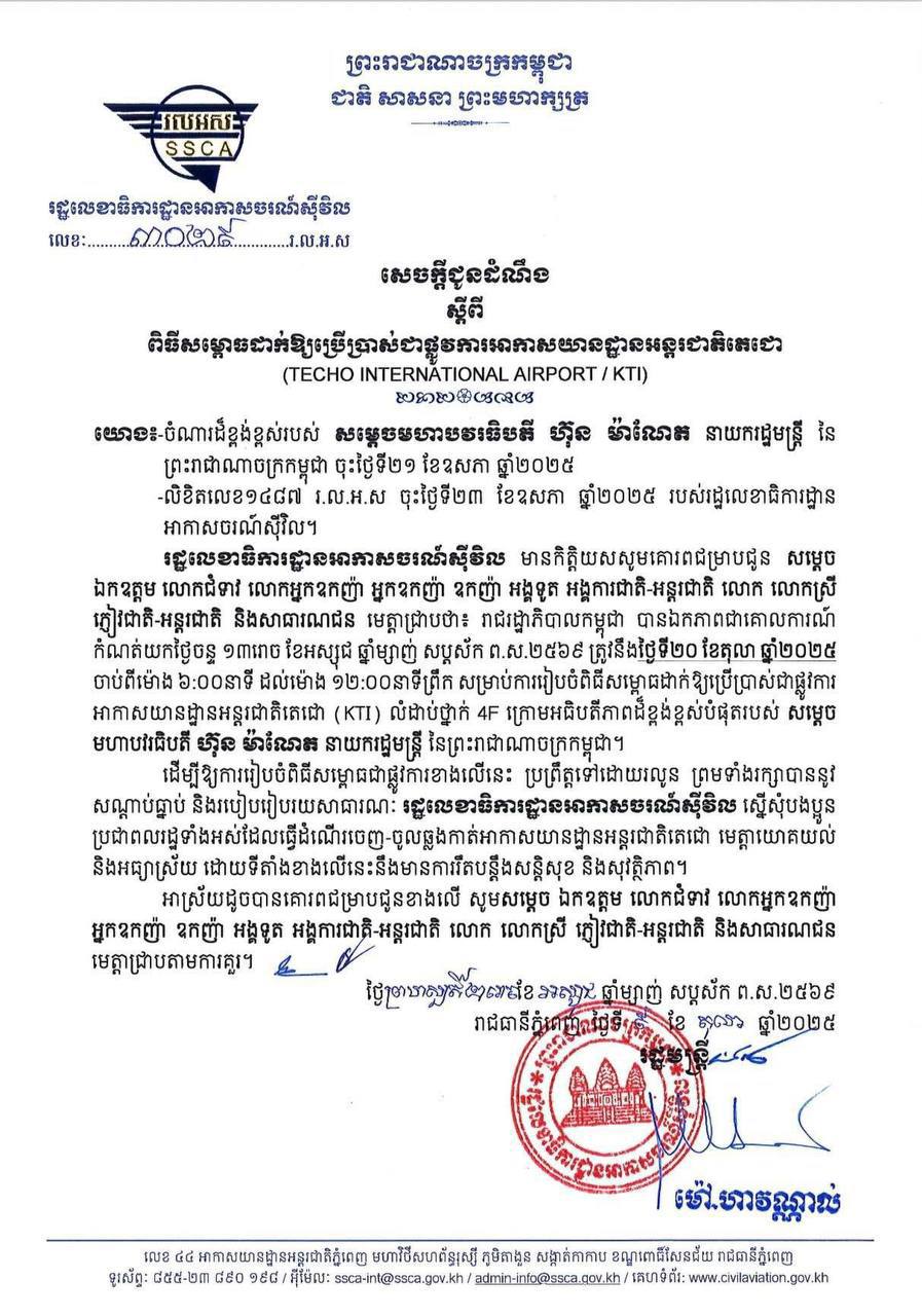 ភ្នំពេញ៖ រដ្ឋលេខាធិការដ្ឋានអាកាសចរណ៍ស៊ីវិល មានកិត្តិយសសូមគោរពជម្រាបជូន សម្តេច ឯកឧត្តម លោកជំទាវ លោកអ្នកឧកញ៉ា អ្នកឧកញ៉ា ឧកញ៉ា អង្គទូត អង្គការជាតិ-អន្តរជាតិ លោក លោកស្រី ភ្ញៀវជាតិ-អន្តរជាតិ និងសាធារណជន មេត្តាជ្រាបថា៖ រាជរដ្ឋាភិបាលកម្ពុជា បានឯកភាពជាគោលការណ៍ កំណត់យកថ្ងៃចន្ទ ១៣រោច ខែអស្សុជ ឆ្នាំម្សាញ់ សប្តស័ក ព.ស.២៥៦៩ ត្រូវនឹងថ្ងៃទី២០ ខែតុលា ឆ្នាំ២០២៥ ចាប់ពីម៉ោង ៦:០០នាទី ដល់ម៉ោង ១២:០០នាទីព្រឹក សម្រាប់ការរៀបចំពិធីសម្ពោធដាក់ឱ្យប្រើប្រាស់ជាផ្លូវការ អាកាសយានដ្ឋានអន្តរជាតិតេជោ (KTI) លំដាប់ថ្នាក់ 4F ក្រោមអធិបតីភាពដ៏ខ្ពង់ខ្ពស់បំផុតរបស់ សម្តេច មហាបវរធិបតី ហ៊ុន ម៉ាណែត នាយករដ្ឋមន្ត្រី នៃព្រះរាជាណាចក្រកម្ពុជា។