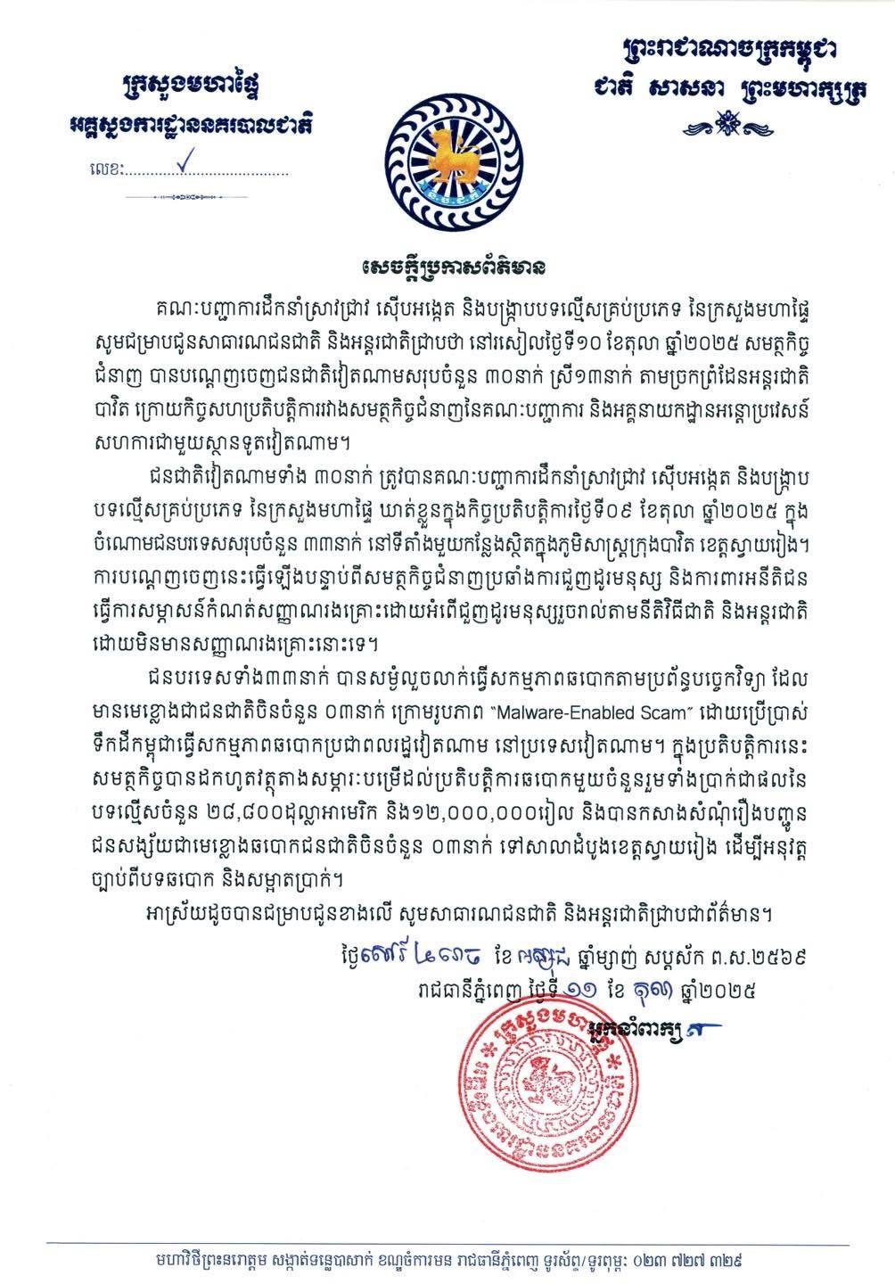 ភ្នំពេញ៖ គណៈបញ្ជាការដឹកនាំស្រាវជ្រាវ ស៊ើបអង្កេត និងបង្ក្រាបបទល្មើសគ្រប់ប្រភេទ នៃក្រសួងមហាផ្ទៃ នៅថ្ងៃសៅរ៍ទី១១ ខែតុលា ឆ្នាំ២០២៥នេះ សូមជម្រាបជូនសាធារណជនជាតិ និងអន្តរជាតិជ្រាបថា នៅរសៀលថ្ងៃទី១០ ខែតុលា ឆ្នាំ២០២៥ សមត្ថកិច្ច ជំនាញ បានបណ្តេញចេញជនជាតិវៀតណាមសរុបចំនួន ៣០នាក់ ស្រី១៣នាក់ តាមច្រកព្រំដែនអន្តរជាតិ បាវិត ក្រោយកិច្ចសហប្រតិបត្តិការរវាងសមត្ថកិច្ចជំនាញនៃគណៈបញ្ជាការ និងអគ្គនាយកដ្ឋានអន្តោប្រវេសន៍ សហការជាមួយស្ថានទូតវៀតណាម។