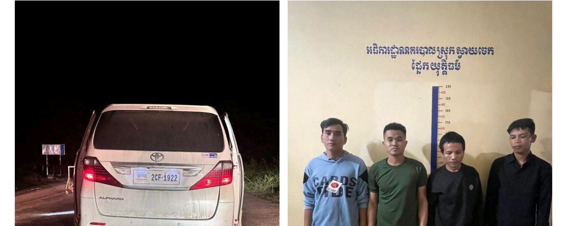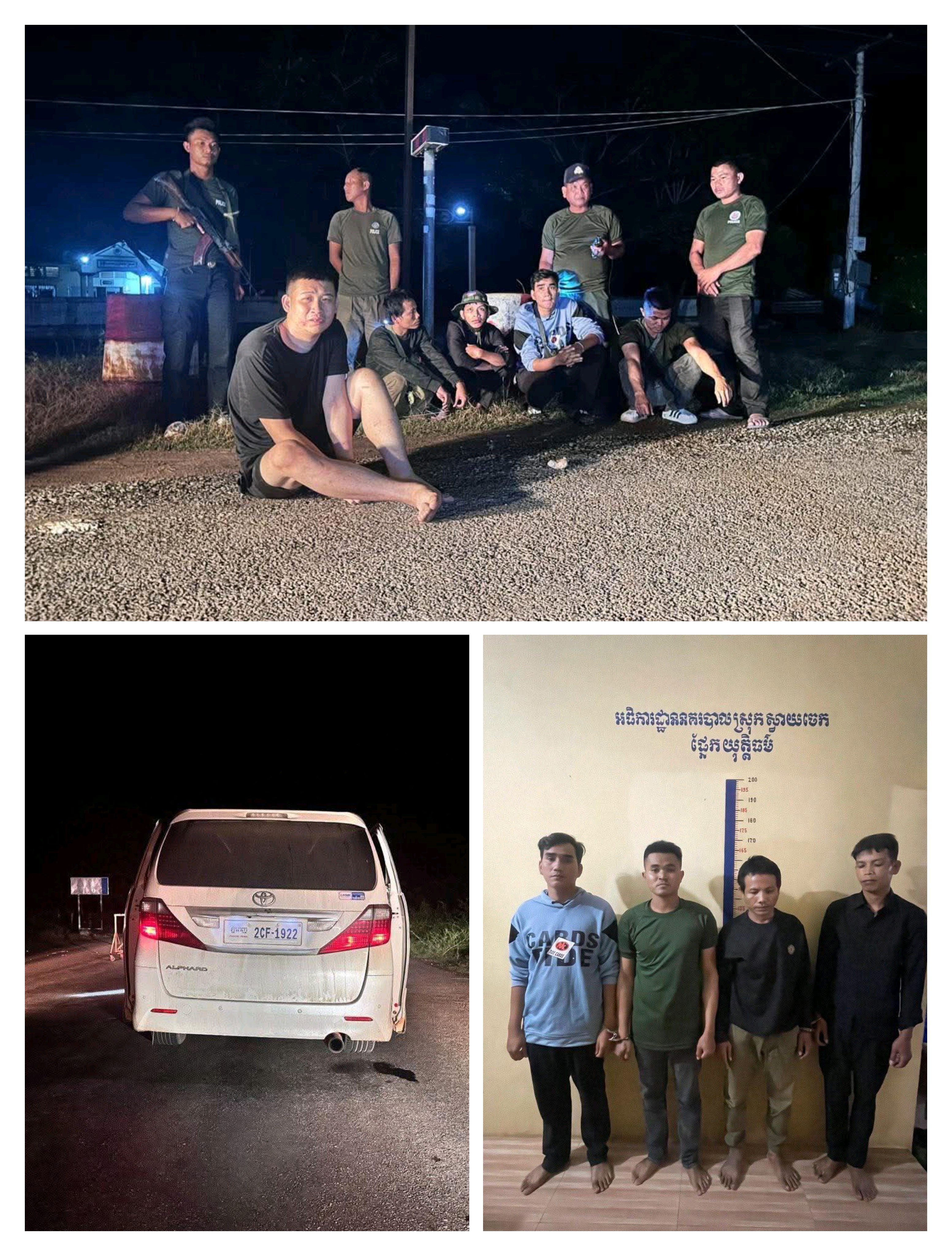 ទី៤៖ឈ្មោះ ឆុន សុភិន ភេទប្រុស អាយុ៣៥ឆ្នាំ រស់នៅភូមិវត្តចាស់ ឃុំតាលាស់ ស្រុកមោងឬស្សី ខេត្តបាត់ដំបង។ ដកហូតរថយន្ត០១គ្រឿង ម៉ាកអាល់ហ្វាត ពណ៌ស ពាក់ស្លាកលេខភ្នំពេញ 2CF-1922។