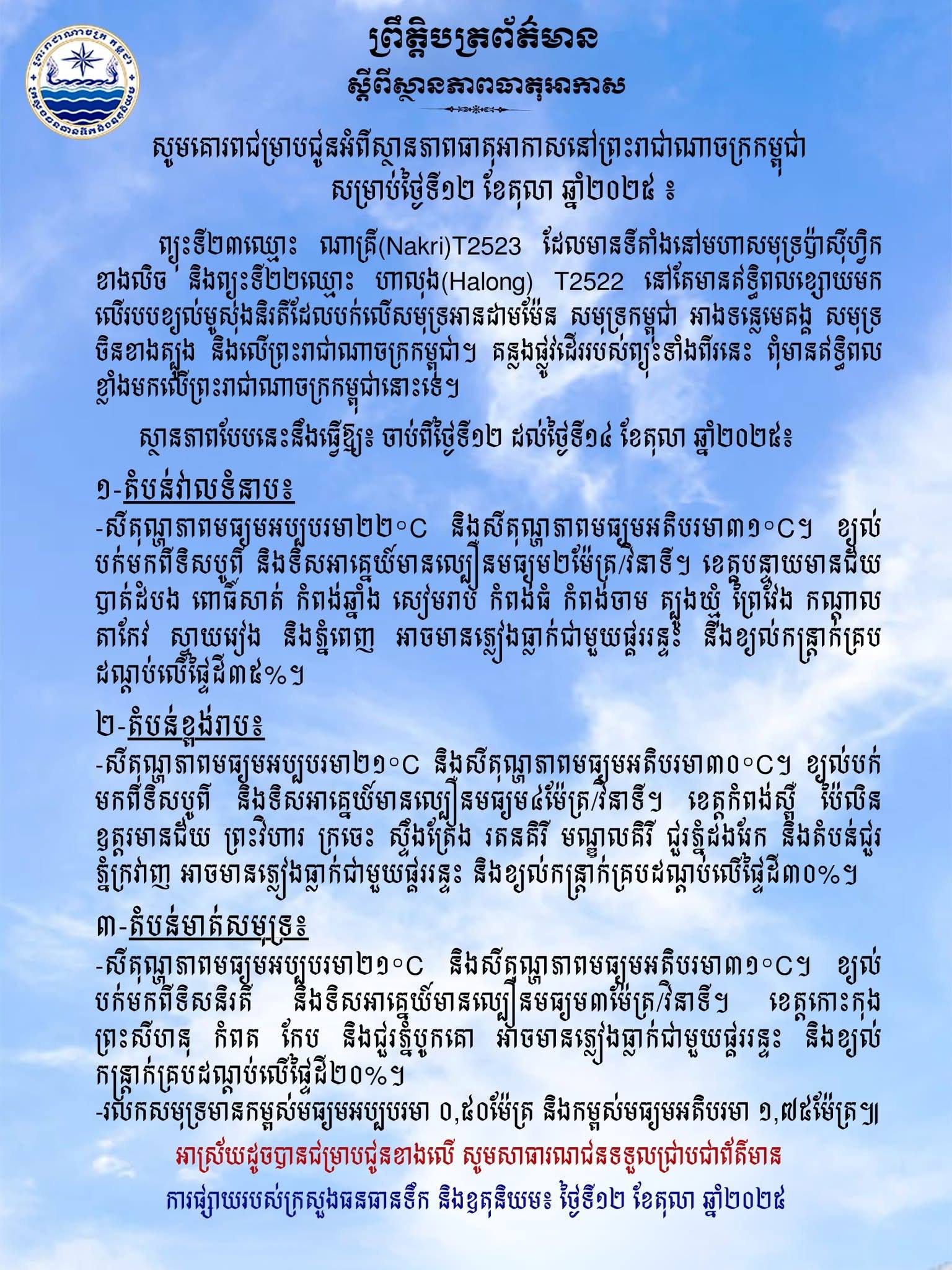 ភ្នំពេញ៖ ក្រសួងធនធានទឹក និងឧតុនិយម នៅព្រឹកថ្ងៃអាទិត្យទី១២ ខែតុលា ឆ្នាំ២០២៥នេះ បានចេញសេចក្ដីជូនដំណឹងស្តីពីស្ថានភាពធាតុអាកាសនៅព្រះរាជាណាចក្រកម្ពុជា ខណៈព្យុះទី២៣ឈ្មោះ ណាគ្រី (Nakri)T2523 ដែលមានទីតាំងនៅមហាសមុទ្រប៉ាស៊ីហ្វិក ខាងលិច និងព្យុះទី២២ឈ្មោះ ហាលុង (Halong) T2522 នៅតែមានឥទ្ធិពលខ្សោយមក លើរបបខ្យល់មូសុងនិរតីដែលបក់លើសមុទ្រអានដាមម៉ែន សមុទ្រកម្ពុជា អាងទន្លេមេគង្គ សមុទ្រ ចិនខាងត្បូង និងលើព្រះរាជាណាចក្រកម្ពុជា។