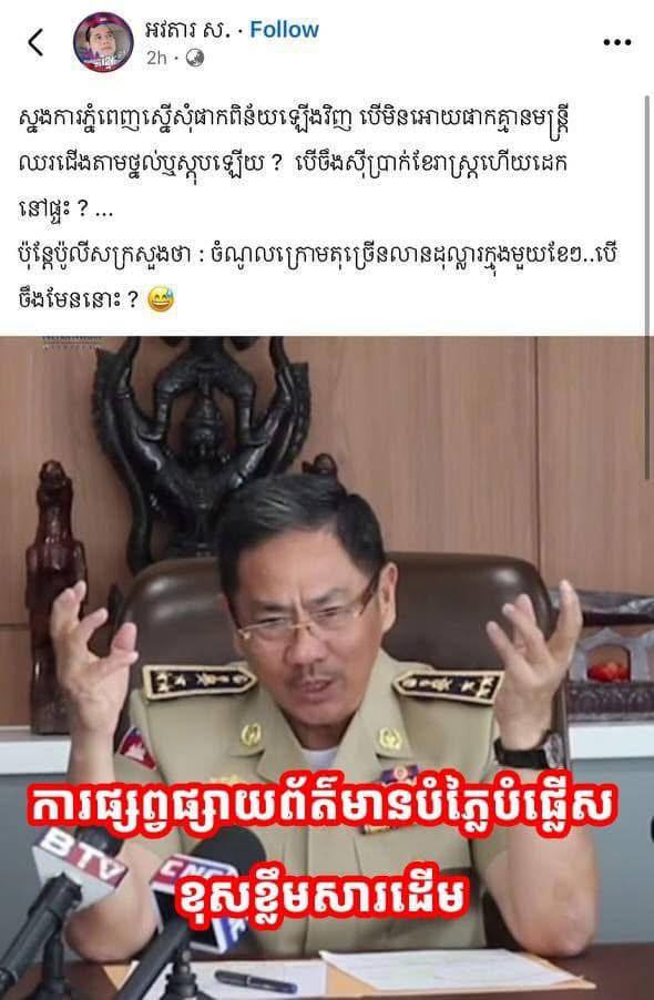 ដូច្នេះស្នើសុំឱ្យម្ចាស់ផេកខាងលើត្រូវកែសម្រួលខ្លឹមសារឡើងវិញហើយត្រូវពិនិត្យនិងស្តាប់ខ្លឹមសារដើមរបស់លោកស្នងការឲ្យបានច្បាស់លាស់ត្រឹមត្រូវ មុននឹងយកទៅបង្ហោះផ្សព្វផ្សាយកុំឲ្យមហាជនមានការយល់ច្រឡំ៕