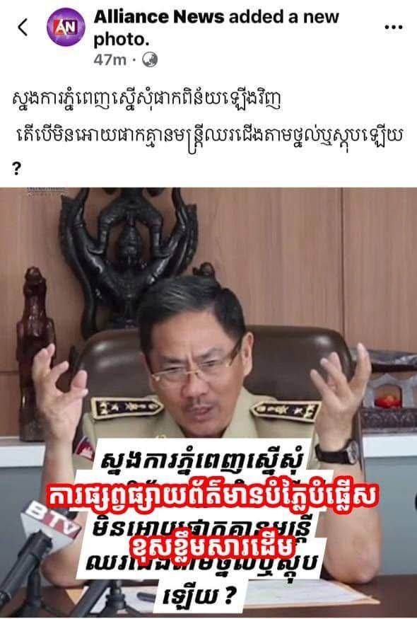 ភ្នំពេញ៖ ក្រុមការងារព័ត៌មាន និងប្រតិកម្មរហ័សនៃស្នងការដ្ឋាននគរបាលរាជធានីភ្នំពេញ នៅថ្ងៃអាទិត្យទី១២ ខែតុលា ឆ្នាំ២០២៥នេះ បំភ្លឺពាក់ព័ន្ធករណីផេកហ្វេសប៊ុកឈ្មោះ អវតា ស និងផេកហ្វេសប៊ុកឈ្មោះ Alliance News ដែលបង្ហោះខ្លឹមសារថា “ស្នងការភ្នំពេញស្នើសុំផាកពិន័យឡើងវិញ តើបើមិនអោយផាកគ្មានមន្ត្រីឈរជើងតាមថ្នល់ឬស្តុបឡើយ ?” ដែលការសរសេរខ្លឹមសារបែបនេះខុសពីខ្លឹមសារដើម ដែលលោកឧត្តមសេនីយ៍ឯក ជួន ណារិន្ទ អគ្គស្នងការរង និងជាស្នងការនគរបាលរាជធានីភ្នំពេញ បានធ្វើកិច្ចសម្ភាសន៍ជាមួយអ្នកសារព័ត៌មាន នាព្រឹកថ្ងៃទី១១ ខែតុលា ឆ្នាំ២០២៥។