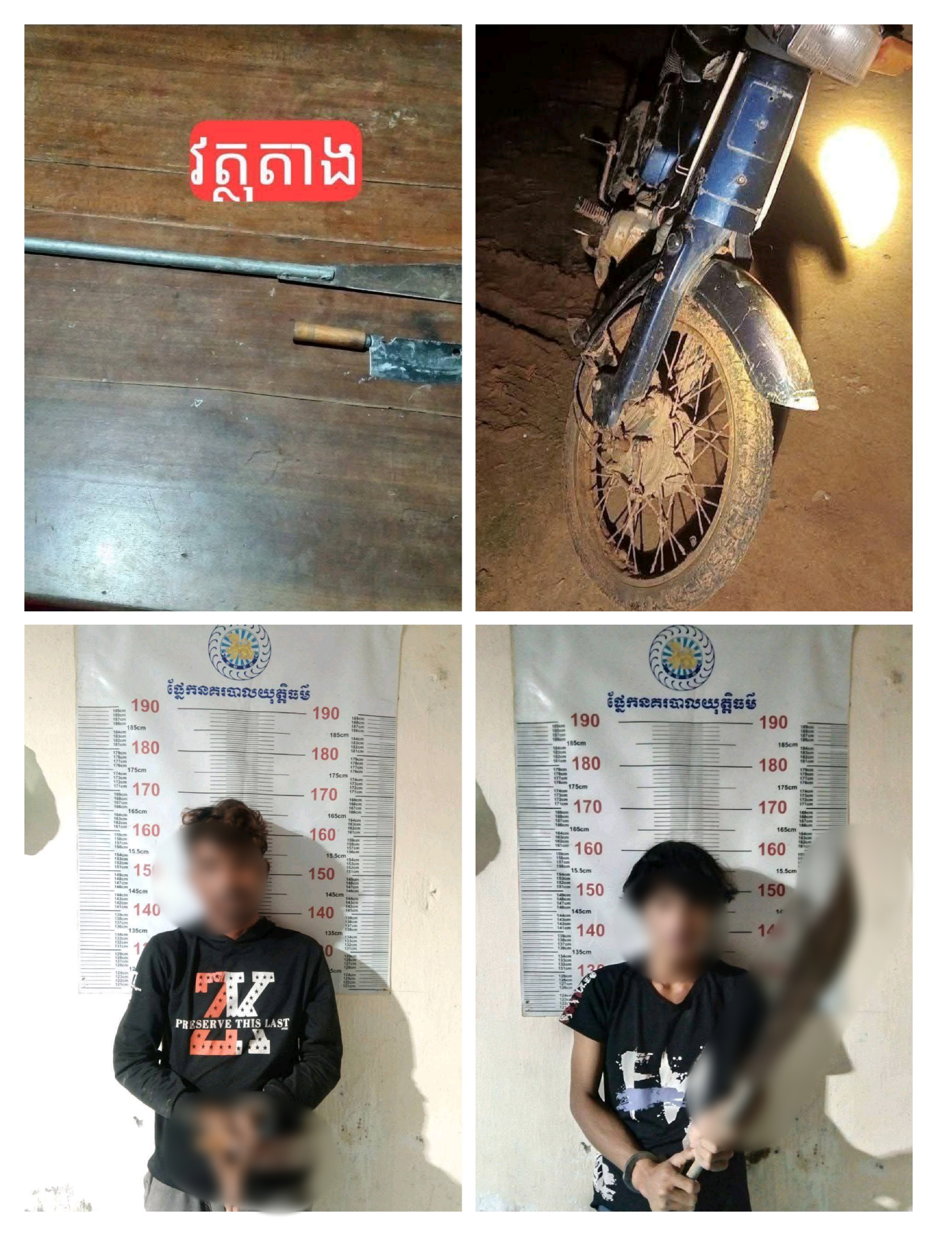 ១/ឈ្មោះ កូយ ឃីត ភេទប្រុសអាយុ២៩ឆ្នាំនៅភូមិអូរតាពូង ឃុំរកាកោះ ស្រុកគងពិសី ខេត្តកំពង់ស្ពឺ(ធ្លាប់ជាប់ពន្ធនាគារ០២លើកនៅខេត្តកំពង់ស្ពឺ) ករណីប្រើ ប្រាស់ដោយខុសច្បាប់នូវសារធាតុញៀនរយ:ពេល០២ ឆ្នាំ និងករណីហិង្សាក្នុងគ្រួសាររយ:ពេល០៨ខែនិង២/ឈ្មោះ ប៉ាល់ រ៉ាម៉េត ភេទប្រុសអាយុ២៤ឆ្នាំនៅភូមិតារោង ឃុំរកាកោះ ស្រុកគងពិសី ខេត្តកំពង់ស្ពឺ (ធ្លាប់ជាប់ពន្ធនាគារ០១លើកនៅខេត្តកំពង់ស្ពឺ) ករណីប្រើ ប្រាស់ដោយខុសច្បាប់នូវសារធាតុញៀន រយ:ពេល០២ ឆ្នាំជិះម៉ូតូម៉ាកហុងដាគុប៩០ ពណ៌ទឹកប៊ិច គ្មានស្លាកលេខ ដោយមានការសង្ស័យក៏បានឃាត់សួរនាំត្រួត ពិនិត្យ ឃើញមានដាវ១ដើម និងកូនកាំបិតបុ័ងតោ១ ដើមនៅជាប់ម៉ូតូ បន្ទាប់មកបានឃាត់យកមកសួរនាំ។