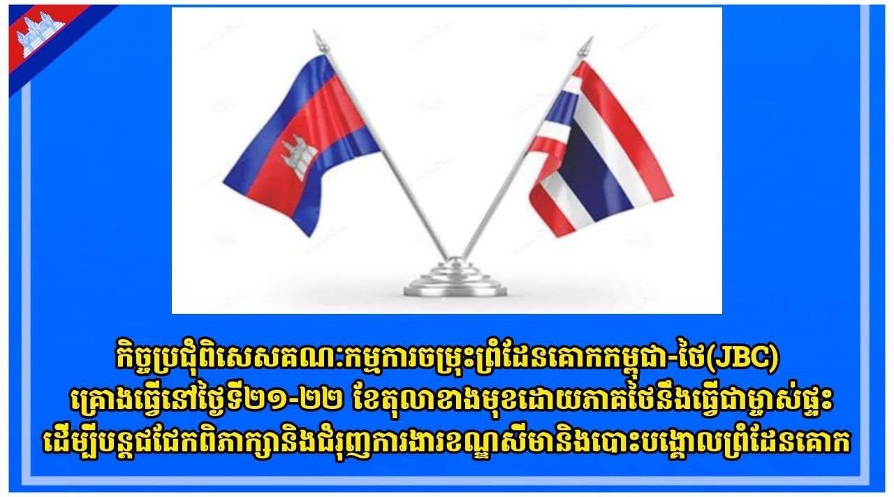 ភ្នំពេញ ៖ នៅថ្ងៃទី១៣ ខែតុលា ឆ្នាំ២០២៥ ប្រភពព័ត៌មានដែលគួរទុកចិត្តបានផ្សព្វផ្សាយថា គណៈកម្មការចម្រុះព្រំដែនគោកកម្ពុជា-ថៃ(JBC) បានឯកភាពគ្នាជាគោលការណ៍ក្នុងការកំណត់កាលបរិច្ឆេទនៃកិច្ចប្រជុំពិសេស(JBC) នៅថ្ងៃទី២១ និងថ្ងៃទី២២ ខែតុលា ឆ្នាំ២០២៥ ដោយភាគីថៃនឹងធ្វើជាម្ចាស់ផ្ទះកិច្ចប្រជុំនេះ។