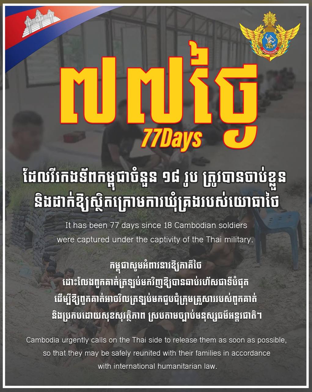 It has been 77 days since 18 Cambodian soldiers were captured under the captivity of the Thai military. Cambodia urgently calls on the Thai side to release them as soon as possible, so that they may be safely reunited with their families in accordance with international humanitarian law.