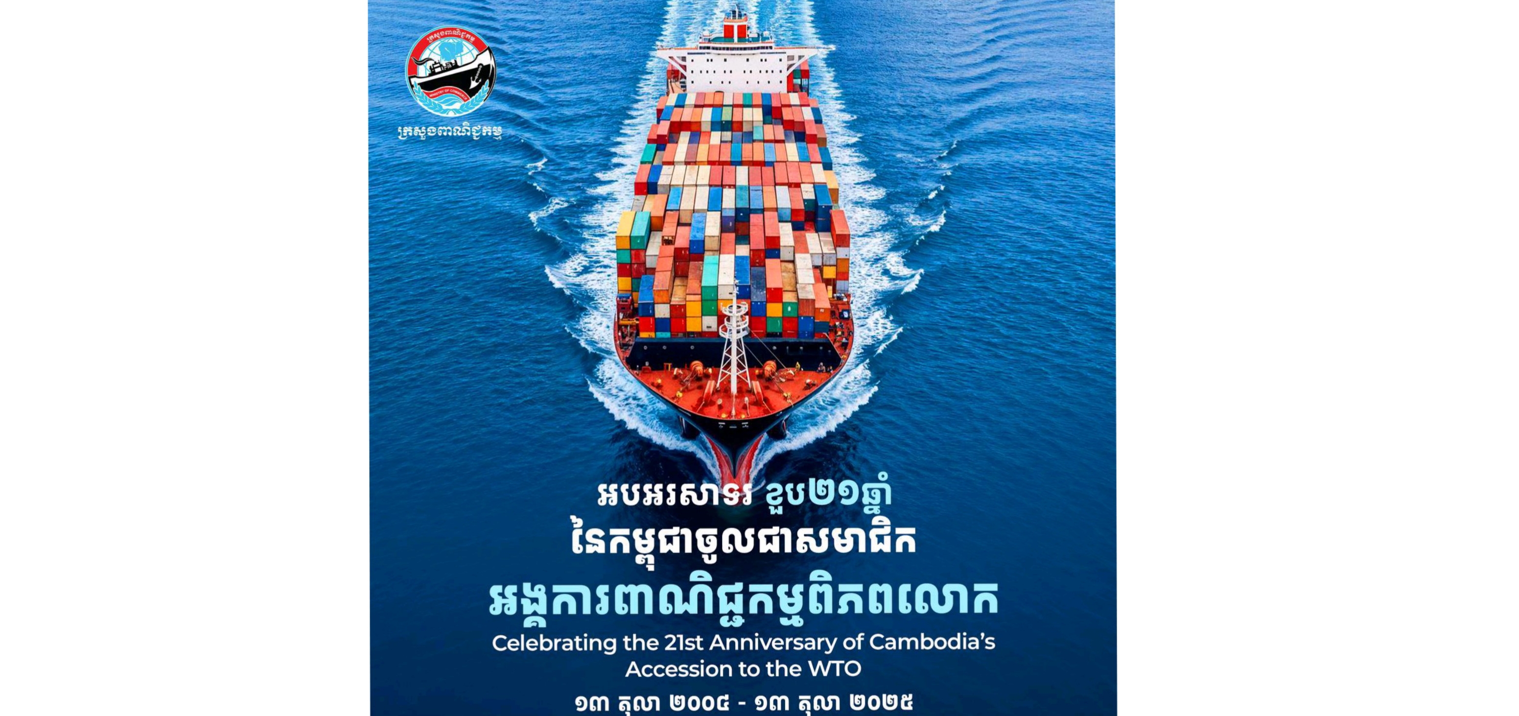 ភ្នំពេញ៖ ក្រសួងពាណិជ្ជកម្មកម្ពុជា បានចាប់ផ្តើមដោយសារ”អបអរសាទរ ខួប២១ឆ្នាំកម្ពុជាចូលជាសមាជិកអង្គការពាណិជ្ជកម្មពិភពលោក(WTO)១៣ តុលា ២០០៤ – ១៣ តុលា ២០២៥”។ កម្ពុជាបានក្លាយជាសមាជិកទី១៤៨នៃWTOនសមាជិកចំនួន ១៦៦ ប្រទេស។ នេះបេីយោងតាមប្រភពព័ត៍មានពីក្រសួងព័ត៌មាន ។