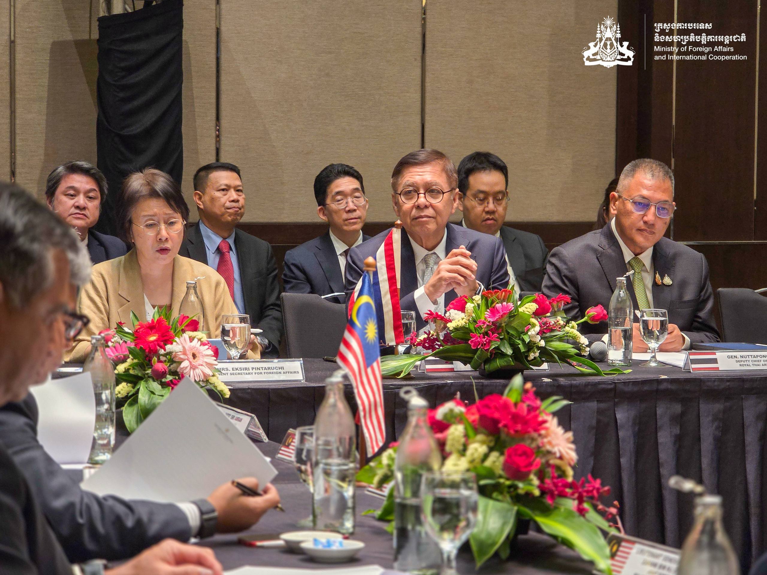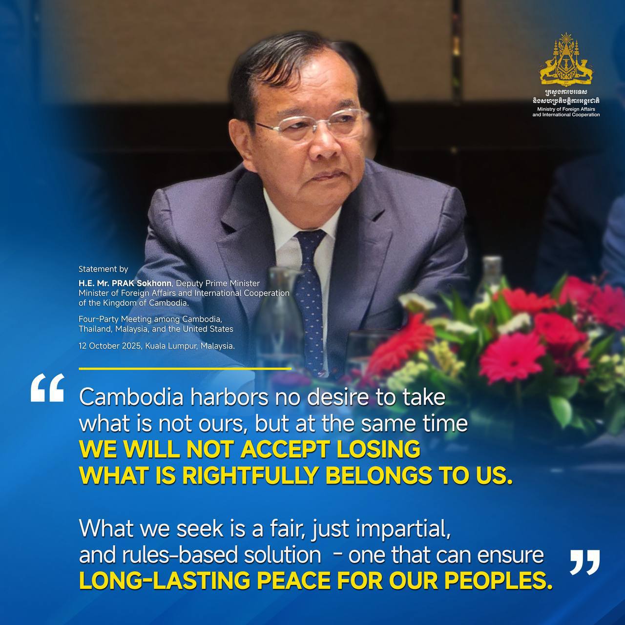 ទីក្រុង​គូឡាឡាំពួ​៖​ លោក ប្រាក់ សុខុន ឧបនាយករដ្ឋមន្រ្តី រដ្ឋមន្រ្តីក្រសួងការបរទេស និងសហប្រតិបត្តិការអន្តរជាតិ បានថ្លែងក្នុងកិច្ចប្រជុំចតុភាគី រវាងប្រទេសកម្ពុជា ថៃ ម៉ាឡេស៊ី និងសហរដ្ឋអាមេរិក នៅថ្ងៃទី១២ ខែតុលា ឆ្នាំ២០២៥ នៅទីក្រុងគូឡាឡាំពួ ថា «កម្ពុជាបានប្រកាន់ជំហរយ៉ាងខ្ជាប់ខ្ជួនក្នុងការដោះស្រាយវិវាទដោយសន្តិវិធី អនុលោមយ៉ាងពេញលេញតាមច្បាប់ អន្តរជាតិ។ យើងគ្មានបំណងចង់យកអ្វីដែលមិនមែនជារបស់យើងទេ ប៉ុន្តែទន្ទឹមនឹងនោះ យើងនឹងមិនទទួលយកការបាត់បង់នូវអ្វីដែលជាកម្មសិទ្ធិរបស់យើងដោយត្រឹមត្រូវនោះទេ។ អ្វីដែលយើងស្វែងរកគឺដំណោះស្រាយប្រកបដោយយុត្តិធម៌ មិនលំអៀង និង ផ្អែកលើច្បាប់ ដែលអាចធានាបាននូវសន្តិភាពយូរអង្វែងសម្រាប់ប្រជាជនយើង។»