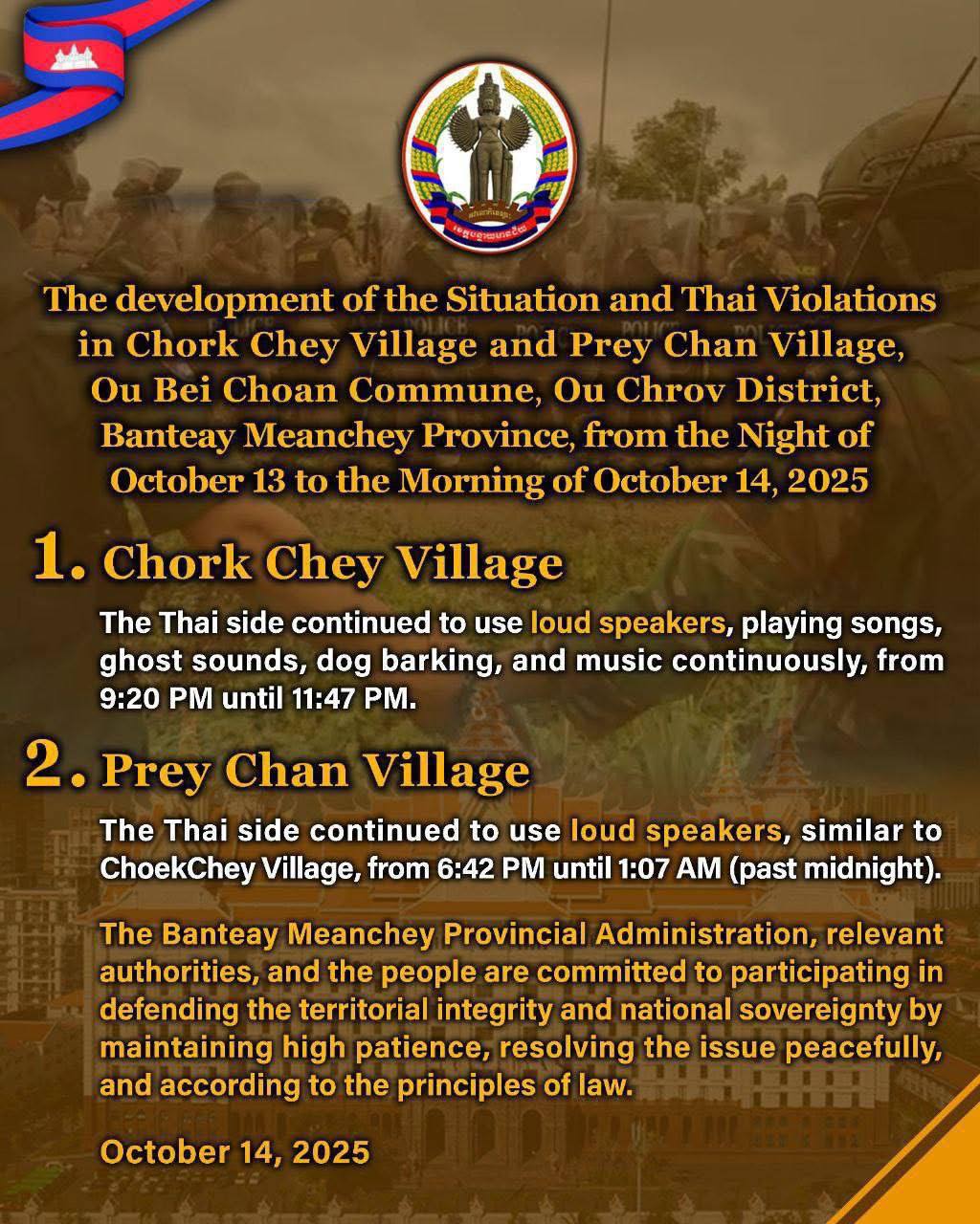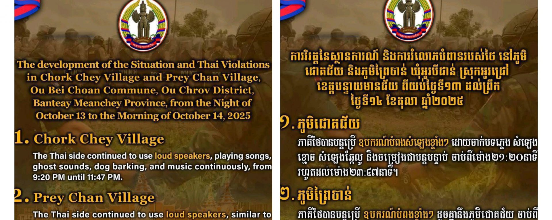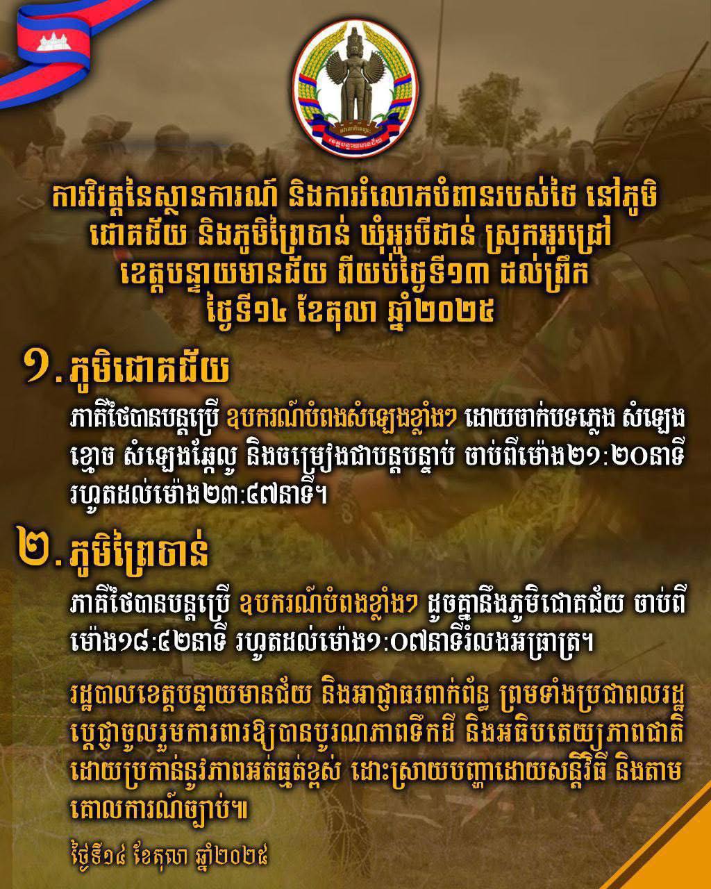 ខេត្តបន្ទាយមានជ័យ៖ រដ្ឋបាលខេត្តបន្ទាយមានជ័យ បានបង្ហាញពីការវិវត្តនៃស្ថានការណ៍ និងការរំលោភបំពានរបស់ថៃ នៅភូមិជោគជ័យ និងភូមិព្រៃចាន់ ឃុំអូរបីជាន់ ស្រុកអូរជ្រៅ ខេត្តបន្ទាយមានជ័យ ពីយប់ថ្ងៃទី១៣ ដល់ព្រឹក ថ្ងៃទី១៤ ខែតុលា ឆ្នាំ២០២៥ មានដូចខាងក្រោម៖