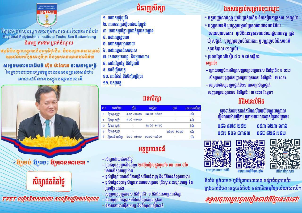 ភ្នំពេញ៖ វិទ្យាស្ថានពហុបច្ចេកទេសភូមិភាគតេជោសែនបាត់ដំបង នៃក្រសួងការងារ និងបណ្តុះបណ្តាលវិជ្ជាជីវៈ ផ្តល់អាហារូបករណ៍ចំនួន ១២ ៧៨០កន្លែង លើ ១១មុខជំនាញ សម្រាប់យុវជនមកពីគ្រួសារក្រីក្រ និងគ្រួសារងាយរងហានិភ័យ ព្រមទាំងផ្ដល់ប្រាក់ឧបត្ថម្ភប្រចាំខែក្រោមកម្មវិធីបណ្តុះបណ្តាលជំនាញវិជ្ជាជីវៈ និងបច្ចេកទេសដល់យុវជនមកពីគ្រួសារក្រីក្រ និងគ្រួសារងាយរងហានិភ័យ (TVET 1.5M)។