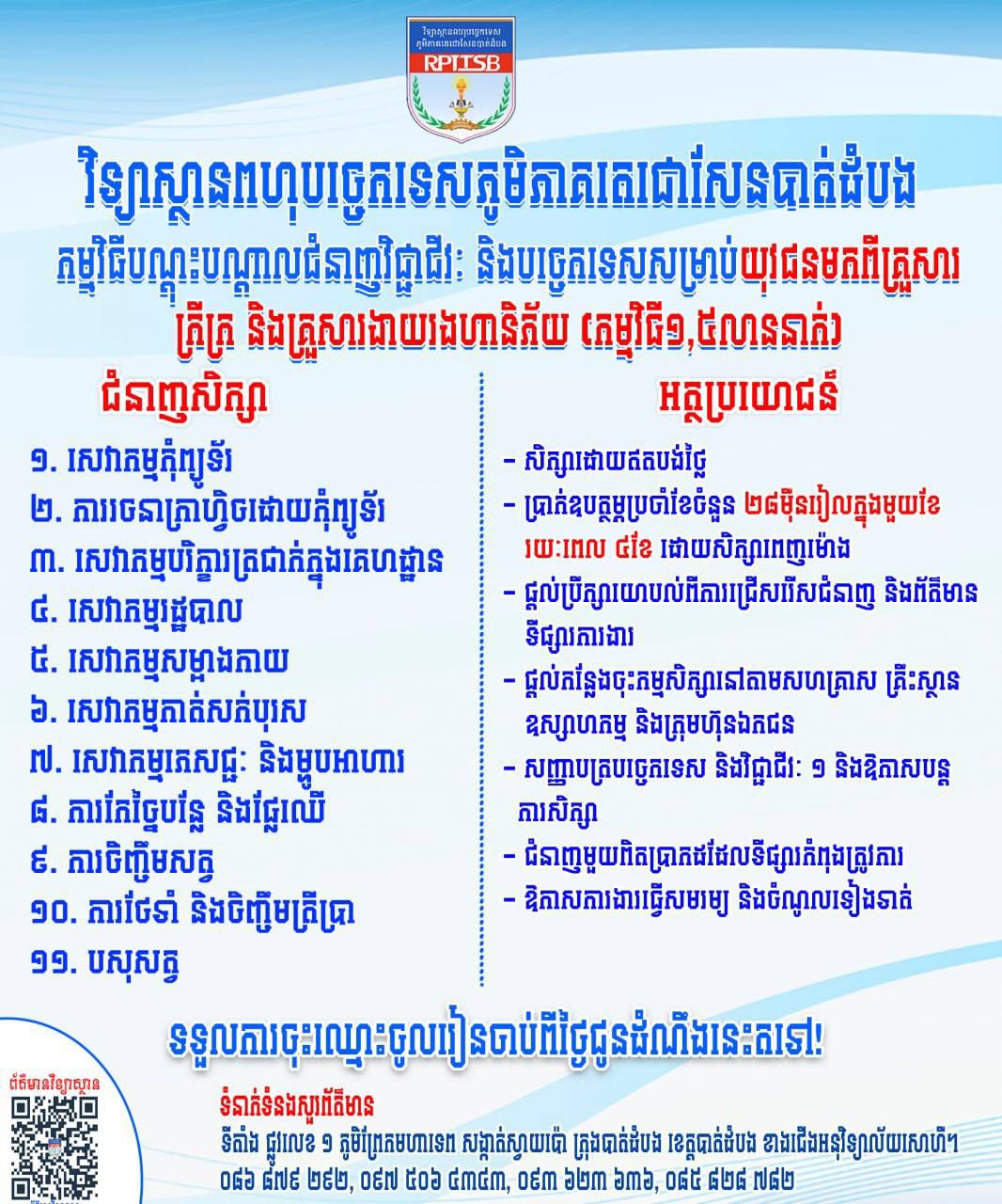 វិទ្យាស្ថានពហុបច្ចេកទេសភូមិភាគតេជោសែនបាត់ដំបង ផ្តល់អាហារូបករណ៍ ១២ ៧៨០កន្លែង លើ ១១មុខជំនាញ និងប្រាក់ឧបត្ថម្ភ សម្រាប់យុវជនមកពីគ្រួសារក្រីក្រ និងគ្រួសារងាយរងហានិភ័យ