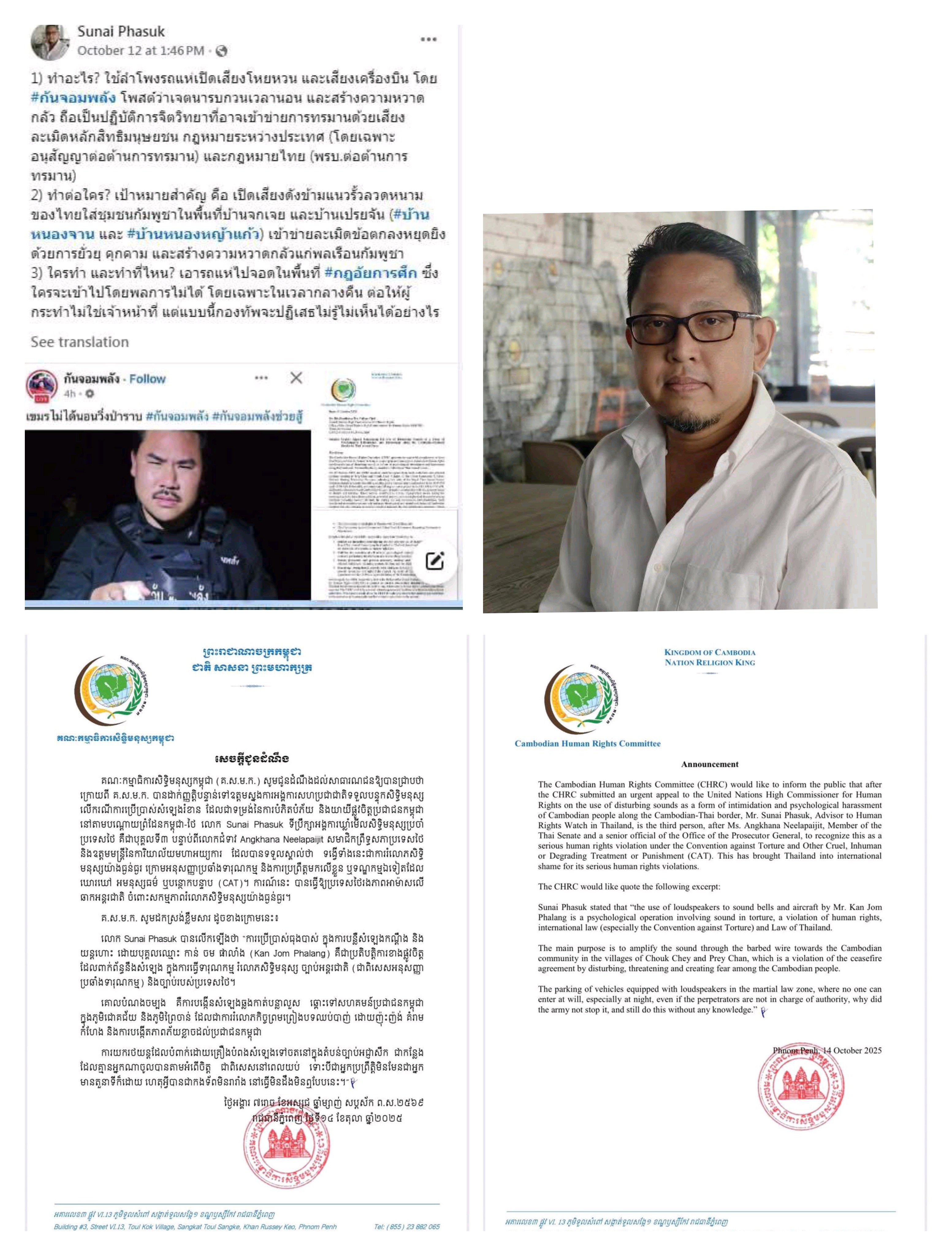 ភ្នំពេញ ៖ លោក កែវ រ៉េមី ទេសរដ្ឋមន្ត្រី ប្រធានគណៈកម្មាធិការសិទ្ធិមនុស្សកម្ពុជា (គ.ស.ម.ក.) នៅរសៀលថ្ងៃទី១៤ ខែតុលា ឆ្នាំ២០២៥ បានបង្ហោះលើផេកផ្លូវការថា ៖ បញ្ញាវ័ន្តរបស់ប្រទេសថៃម្នាក់ទៀត បានចេញមកទទួលស្គាល់ថា ការប្រើប្រាស់សំឡេងរំខាន ជាទម្រង់នៃការបំភិតបំភ័យ និងយាយីផ្លូវចិត្តប្រជាជនកម្ពុជា នៅតាមណ្តោយព្រំដែនកម្ពុជាថៃ ជាការរំលោភសិទ្ធិមនុស្សយ៉ាងធ្ងន់ធ្ងរ ប្រឆាំងនឹងច្បាប់សិទ្ធិមនុស្សអន្តរជាតិ ក៏ដូចជាច្បាប់ប្រទេសថៃ ដែលការណ៍នេះបានធ្វើឱ្យប្រទេសថៃរងភាពអាម៉ាសលើឆាកអន្តរជាតិ។ លោក កែវ រ៉េមី ទេសរដ្ឋមន្ត្រី ប្រធានគណៈកម្មាធិការសិទ្ធិមនុស្សកម្ពុជា (គ.ស.ម.ក.) បានបន្តថា ៖ នេះគឺបុគ្គលទី៣ ហើយ បន្ទាប់ពីលោកជំទាវ Angkhana Neelapaijit និងឧត្តមមន្រ្តីនៃការិយាល័យមហាអយ្យការប្រទេសថៃ ៕