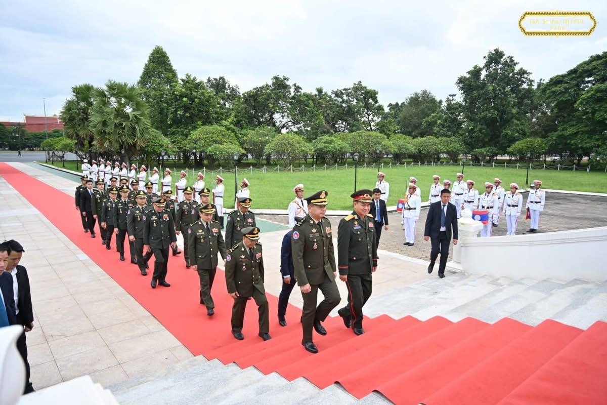 រដ្ឋធានីវៀងចន្ទន៍ ៖ លោក នាយឧត្តមសេនីយ៍ ទៀ សីហា ឧបនាយករដ្ឋមន្ត្រី រដ្ឋមន្ត្រីក្រសួងការពារជាតិ ដឹកនាំគណៈប្រតិភូជាន់ខ្ពស់ក្រសួងការពារជាតិ ចូលដាក់កម្រងផ្កា និងគោរពវិញ្ញាក្ខន្ធ នៅស្តូបយុទ្ធជន នីលាក់ណាម រដ្ឋធានីវៀងចន្ទន៍ សាធារណរដ្ឋប្រជាធិបតេយ្យប្រជាមានិតឡាវ នាថ្ងៃទី១៤ ខែតុលា ឆ្នាំ២០២៥។