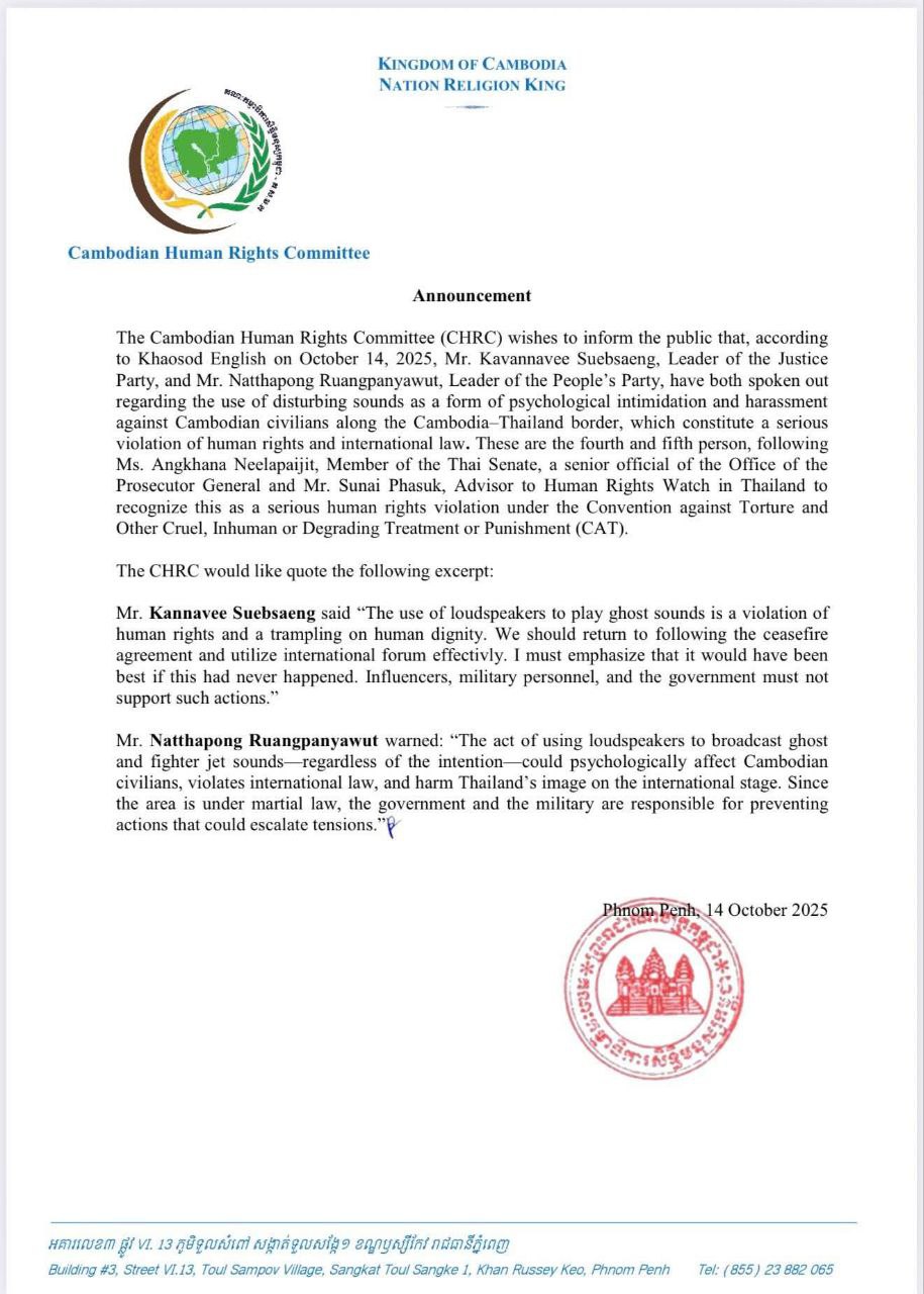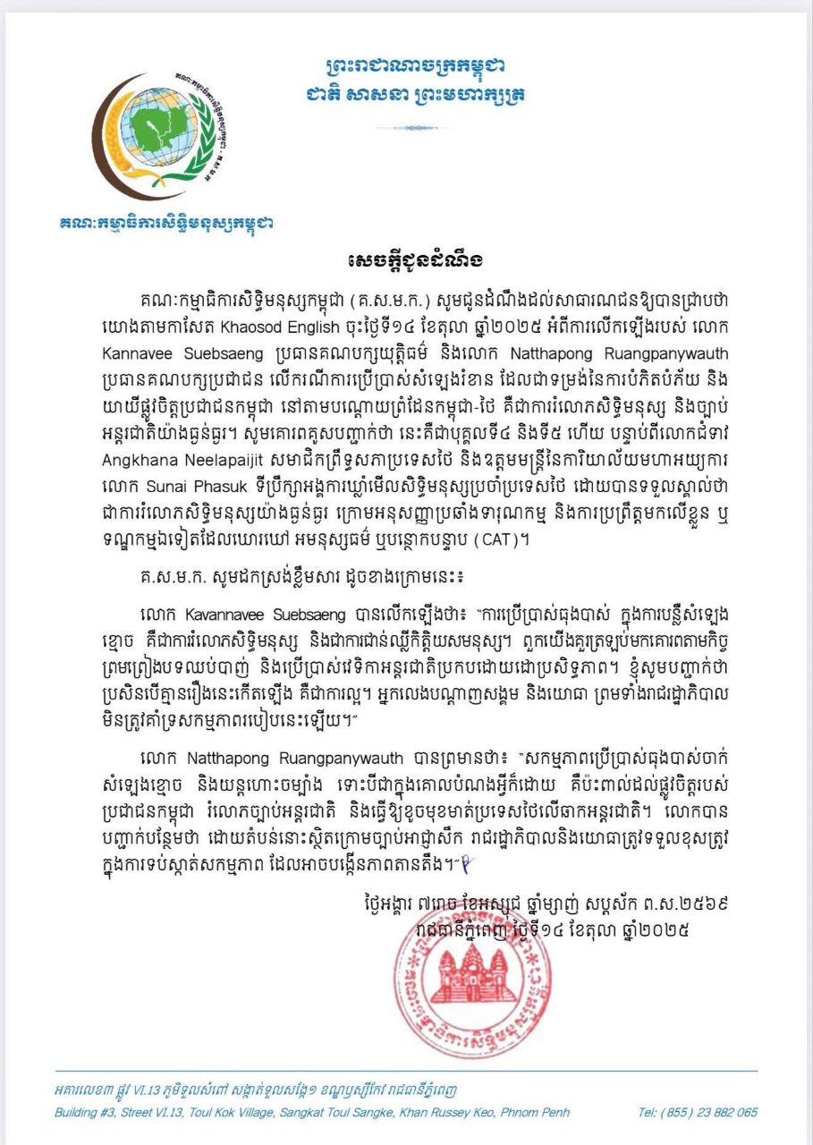 សូមបញ្ជាក់ថា, នៅថ្ងៃនេះ ! គណៈកម្មាធិការសិទ្ធិមនុស្សកម្ពុជា (គ.ស.ម.ក.) សូមជូនដំណឹងដល់សាធារណជនឱ្យបានជ្រាបថា យោងតាមកាសែត Khaosod English ចុះថ្ងៃទី១៤ ខែតុលា ឆ្នាំ២០២៥ អំពីការលើកឡើងរបស់ លោក Kannavee Suebsaeng ប្រធានគណបក្សយុត្តិធម៌ និងលោក Natthapong Ruangpanywauth ប្រធានគណបក្សប្រជាជន លើករណីការប្រើប្រាស់សំឡេងរំខាន ដែលជាទម្រង់នៃការបំភិតបំភ័យ និង យាយីផ្លូវចិត្តប្រជាជនកម្ពុជា នៅតាមបណ្តោយព្រំដែនកម្ពុជា-ថៃ គឺជាការរំលោភសិទ្ធិមនុស្ស និងច្បាប់ អន្តរជាតិយ៉ាងធ្ងន់ធ្ងរ។ សូមគោរពគូសបញ្ជាក់ថា នេះគឺជាបុគ្គលទី៤ និងទី៥ ហើយ បន្ទាប់ពីលោកជំទាវ Angkhana Neelapaijit សមាជិកព្រឹទ្ធសភាប្រទេសថៃ និងឧត្តមមន្ត្រីនៃការិយាល័យមហាអយ្យការ លោក Sunai Phasuk ទីប្រឹក្សាអង្គការឃ្លាំមើលសិទ្ធិមនុស្សប្រចាំប្រទេសថៃ ដោយបានទទួលស្គាល់ថា ជាការរំលោភសិទ្ធិមនុស្សយ៉ាងធ្ងន់ធ្ងរ ក្រោមអនុសញ្ញាប្រឆាំងទារុណកម្ម និងការប្រព្រឹត្តមកលើខ្លួន ឬ ទណ្ឌកម្មឯទៀតដែលឃោរឃៅ អមនុស្សធម៌ ឬបន្ថោកបន្ទាប (CAT)។