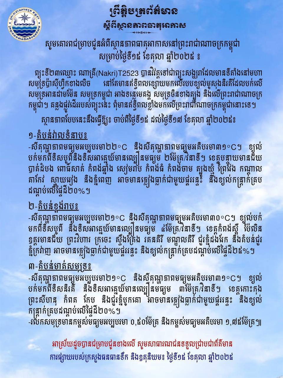 ភ្នំពេញ៖ ក្រសួងធនធានទឹក និងឧតុនិយម នៅព្រឹកថ្ងៃពុធទី១៥ ខែតុលា ឆ្នាំ២០២៥នេះ បានចេញសេចក្ដីជូនដំណឹងស្តីពីស្ថានភាពធាតុអាកាសនៅព្រះរាជាណាចក្រកម្ពុជា ខណៈព្យុះទី២៣ឈ្មោះ ណាគ្រី (Nakri) T2523 បានវិវត្តទៅជាព្យុះសង្ឃរាដែលមានទីតាំងនៅមហា សមុទ្រប៉ាស៊ីហ្វិកខាងលិច នៅតែមានឥទ្ធិពលខ្សោយមកលើរបបខ្យល់មូសុងនិរតីដែលបក់លើ សមុទ្រអានដាមម៉ែន សមុទ្រកម្ពុជា អាងទន្លេមេគង្គ សមុទ្រចិនខាងត្បូង និងលើព្រះរាជាណាចក្រ កម្ពុជា។