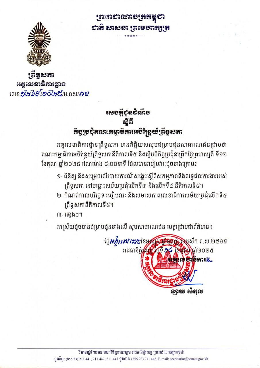 ភ្នំពេញ៖ យោងតាមសេចក្តីប្រកាសព័ត៌មាន របស់អគ្គលេខាធិការដ្ឋានព្រឹទ្ធសភា បានឱ្យដឹងថា ព្រឹទ្ធសភា ព្រឹកថ្ងៃព្រហស្បតិ៍ ទី១៦ ខែតុលា ឆ្នាំ២០២៥ នឹងបើកកិច្ចប្រជុំគណៈកម្មាធិការអចិន្ត្រៃយ៍របស់ខ្លួន ដោយមានរបៀបវារៈចំនួន៣។