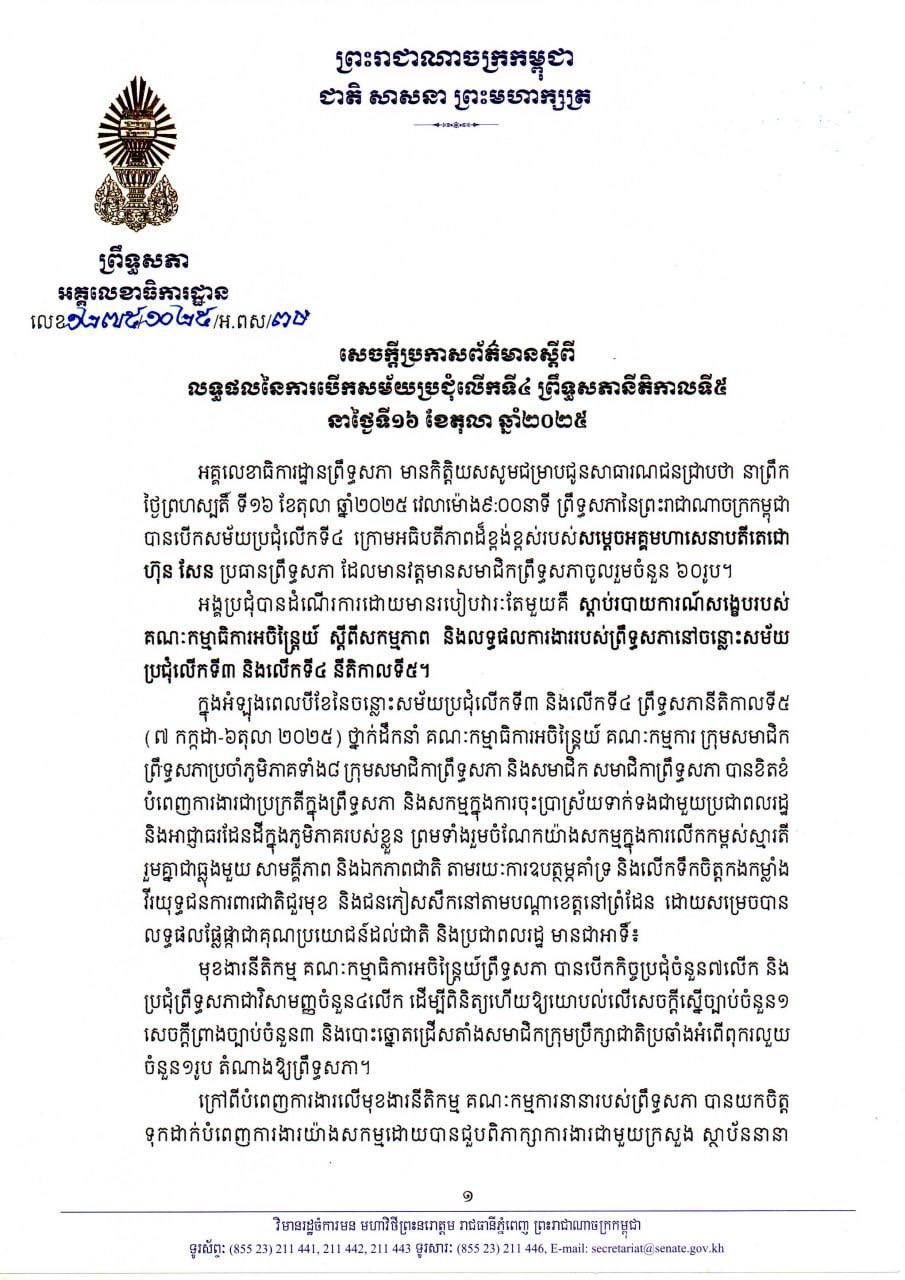 ភ្នំពេញ៖ អគ្គលេខាធិការដ្ឋានព្រឹទ្ធសភា មានកិត្តិយសសូមជម្រាបជូនសាធារណជនជ្រាបថា នាព្រឹក ថ្ងៃព្រហស្បតិ៍ ទី១៦ ខែតុលា ឆ្នាំ២០២៥ វេលាម៉ោង៩:០០នាទី ព្រឹទ្ធសភានៃព្រះរាជាណាចក្រកម្ពុជា បានបើកសម័យប្រជុំលើកទី៤ ក្រោមអធិបតីភាពដ៏ខ្ពង់ខ្ពស់របស់សម្តេចអគ្គមហាសេនាបតីតេជោ ហ៊ុន សែន ប្រធានព្រឹទ្ធសភា ដែលមានវត្តមានសមាជិកព្រឹទ្ធសភាចូលរួមចំនួន ៦០រូប។