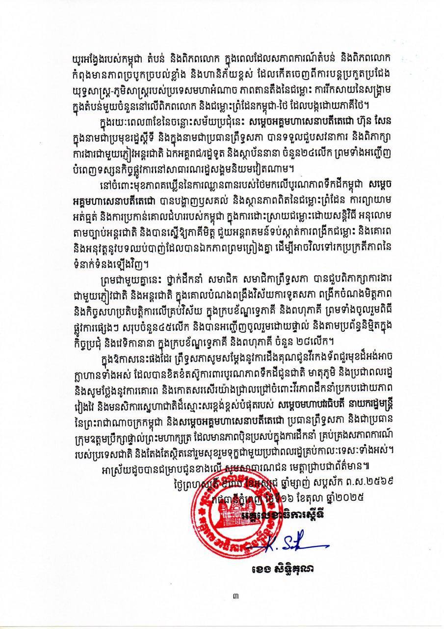 ក្នុងឱកាសនេះផងដែរ ព្រឹទ្ធសភាសូមសម្តែងនូវការដឹងគុណជូនវីរកងទ័ពជួរមុខដ៏អង់អាច ក្លាហានទាំងអស់ ដែលបានខិតខំតស៊ូការពារបូរណភាពទឹកដីជូនជាតិ មាតុភូមិ និងប្រជាពលរដ្ឋ និងសូមថ្លែងនូវការគោរព និងកោតសរសើរយ៉ាងជ្រាលជ្រៅចំពោះវីរភាពដឹកនាំប្រកបដោយភាព វៀងវៃ និងមនសិការស្នេហាជាតិដ៏ស្មោះសរខ្ពង់ខ្ពស់បំផុតរបស់ សម្តេចមហាបវរធិបតី នាយករដ្ឋមន្ត្រី នៃព្រះរាជាណាចក្រកម្ពុជា និងសម្តេចអគ្គមហាសេនាបតីតេជោ ប្រធានព្រឹទ្ធសភា និងជាប្រធាន ក្រុមឧត្តមប្រឹក្សាផ្ទាល់ព្រះមហាក្សត្រ ដែលមានភាពប៉ិនប្រសប់ក្នុងការដឹកនាំ គ្រប់គ្រងសភាពការណ៍