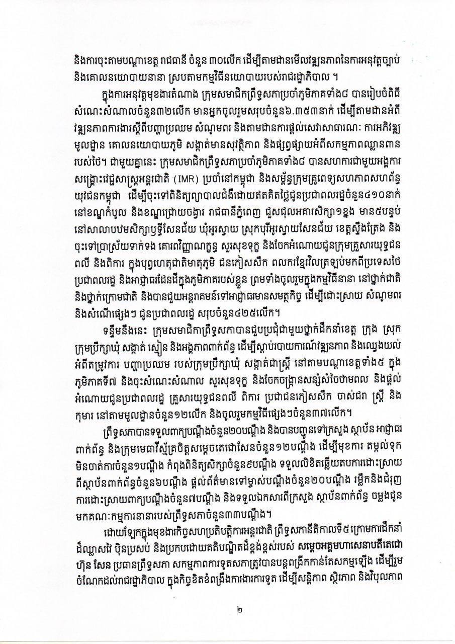 ព្រឹទ្ធសភាបានទទួលពាក្យបណ្ដឹងចំនួន២០បណ្ដឹង និងបានបញ្ជូនទៅក្រសួង ស្ថាប័ន អាជ្ញាធរ ពាក់ព័ន្ធ និងក្រុមមេធាវីស្ម័គ្រចិត្តសម្តេចតេជោសែនចំនួន១២បណ្តឹង ដើម្បីមុខការ តម្កល់ទុក មិនចាត់ការចំនួន១បណ្ដឹង កំពុងពិនិត្យសិក្សាចំនួន៩បណ្ដឹង ទទួលលិខិតឆ្លើយតបការដោះស្រាយ ពីស្ថាប័នពាក់ព័ន្ធចំនួន៦បណ្ដឹង ផ្តល់ព័ត៌មានទៅម្ចាស់បណ្ដឹងចំនួន២០បណ្ដឹង រម្លឹកនិងជំរុញ ការដោះស្រាយពាក្យបណ្តឹងចំនួន៧បណ្ដឹង និងទទួលឯកសារពីក្រសួង ស្ថាប័នពាក់ព័ន្ធ ចម្លងជូន មកគណៈកម្មការនានារបស់ព្រឹទ្ធសភាចំនួន៣៣បណ្ដឹង។