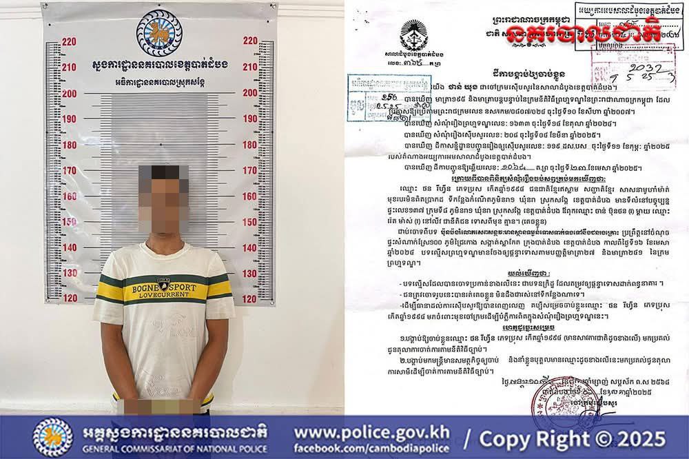 ខេត្តបាត់ដំបង ៖ នៅថ្ងៃទី១៦ ខែតុលា ឆ្នាំ២០២៥ វេលាម៉ោង១០និង១០នាទី នៅចំណុចភូមិនរា១ ឃុំនរា ស្រុកសង្កែ ខេត្តបាត់ដំបង កម្លាំងផ្នែកនគរបាលយុត្តិធម៌ នៃអធិការដ្ឋាននគរបាលស្រុកសង្កែ ដឹកនាំដោយលោកវរសេនីយ៍ទោ យុត តុងហូ អធិការនគរបាលស្រុកសង្កែ បានចុះអនុវត្តដីកាបង្គាប់ឱ្យចាប់ខ្លួនលេខ ៣៦៥ ត.ព្រ ចុះថ្ងៃទី០៦ ខែឧសភា ឆ្នាំ២០២៥ របស់លោក ថាន់ ឃុន ចៅក្រមស៊ើបសួរ នៃសាលាដំបូងខេត្តបាត់ដំបង ។