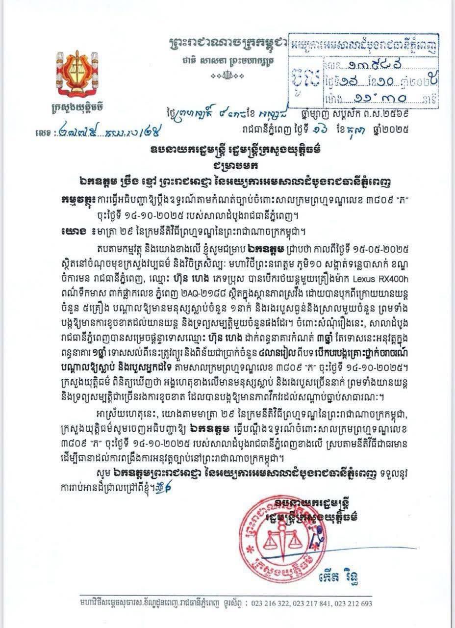 គួររម្លឹកថា ឈ្មោះ ហ៊ុន ហេង ភេទប្រុស បានបើករថយន្តមួយគ្រឿងម៉ាក Lexus RX400h ពណ៌ទឹកមាស ពាក់ផ្លាកលេខ ភ្នំពេញ ២AQ-២១៨៨ ស្ថិតក្នុងស្ថានភាពស្រវឹង ដោយបានបុកពីក្រោយយានយន្ត ចំនួន ៥គ្រឿង បណ្តាលឱ្យមានមនុស្សស្លាប់ចំនួន ១នាក់ និងរងរបួសធ្ងន់និងស្រាលមួយចំនួន ព្រមទាំង បង្កឱ្យមានការខូចខាតដល់យានយន្ត និងទ្រព្យសម្បត្តិមួយចំនួនផងដែរ។ ចំពោះសំណុំរឿងនេះ, សាលាដំបូង រាជធានីភ្នំពេញបានសម្រេចផ្តន្ទាទោសឈ្មោះ ហ៊ុន ហេង ដាក់ពន្ធនាគារកំណត់ ៣ឆ្នាំ តែទោសនេះអនុវត្តក្នុង ពន្ធនាគារ ១ឆ្នាំ ទោសសល់ពីនេះត្រូវព្យួរ និងពិន័យជាប្រាក់ចំនួន ៤លានរៀល ពីបទ បើកបរបង្កគ្រោះថ្នាក់ចរាចរណ៍ បណ្តាលឱ្យស្លាប់ និងរបួសអ្នកដទៃ តាមសាលក្រមព្រហ្មទណ្ឌលេខ ៣៨០៩ “ភ” ចុះថ្ងៃទី ១៤-១០-២០២៥។