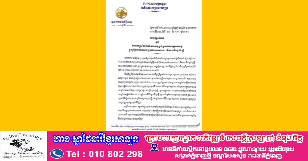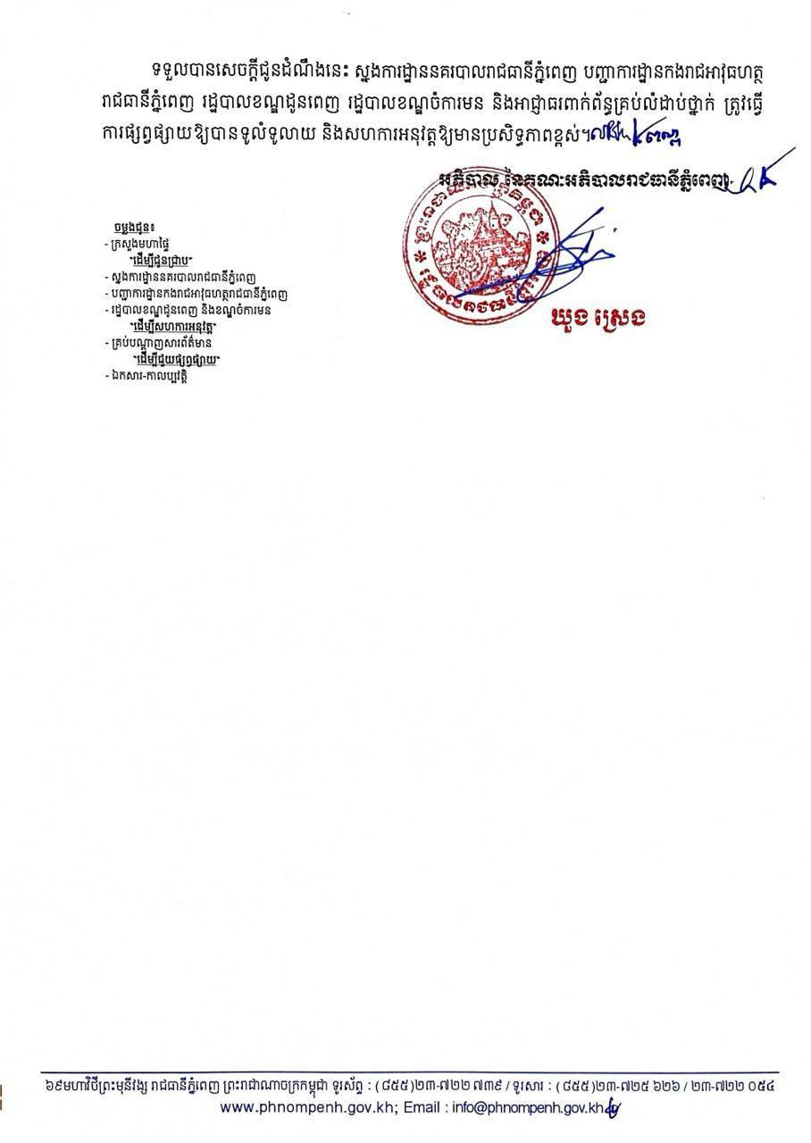 ទទួលបានសេចក្តីជូនដំណឹងនេះ ស្នងការដ្ឋាននគរបាលរាជធានីភ្នំពេញបញ្ជាការដ្ឋានកងរាជអាវុធហត្ថ រាជធានីភ្នំ ពេញ រដ្ឋបាលខណ្ឌដូនពេញ រដ្ឋបាលខណ្ឌចំការមន និងអាជ្ញាធរពាក់ព័ន្ធគ្រប់លំដាប់ថ្នាក់ ត្រូវធ្វើ ការផ្សព្វផ្សាយឱ្យបានទូលំទូលាយ និងសហការអនុវត្តឱ្យមានប្រសិទ្ធភាពខ្ពស់ ៕ ដោយ សំរិត