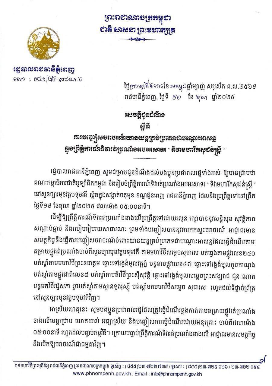 អាស្រ័យហេតុនេះ សូមបងប្អូនប្រជាពលរដ្ឋដែលត្រូវធ្វើដំ ណើរឆ្លងកាត់តាមតម្រាយផ្លូវរត់ប្រណាំង ខាងលើមេត្តាជ្រាប យោគយល់ អធ្យាស្រ័យ និងបញ្ជៀសការធ្វើដំណើរដោយអនុគ្រោះ ចាប់ពីវេលាម៉ោង ០៥:០០នាទី រហូតដល់បញ្ចប់កម្មវិធី។ ក្រោយបញ្ចប់ព្រឹត្តិការណ៍ទិវារត់ប្រណាំងខាងលើ អាជ្ញាធរមានសមត្ថកិច្ច នឹងបើកឱ្យចរាចរណ៍ជាធម្មតាវិញ។
