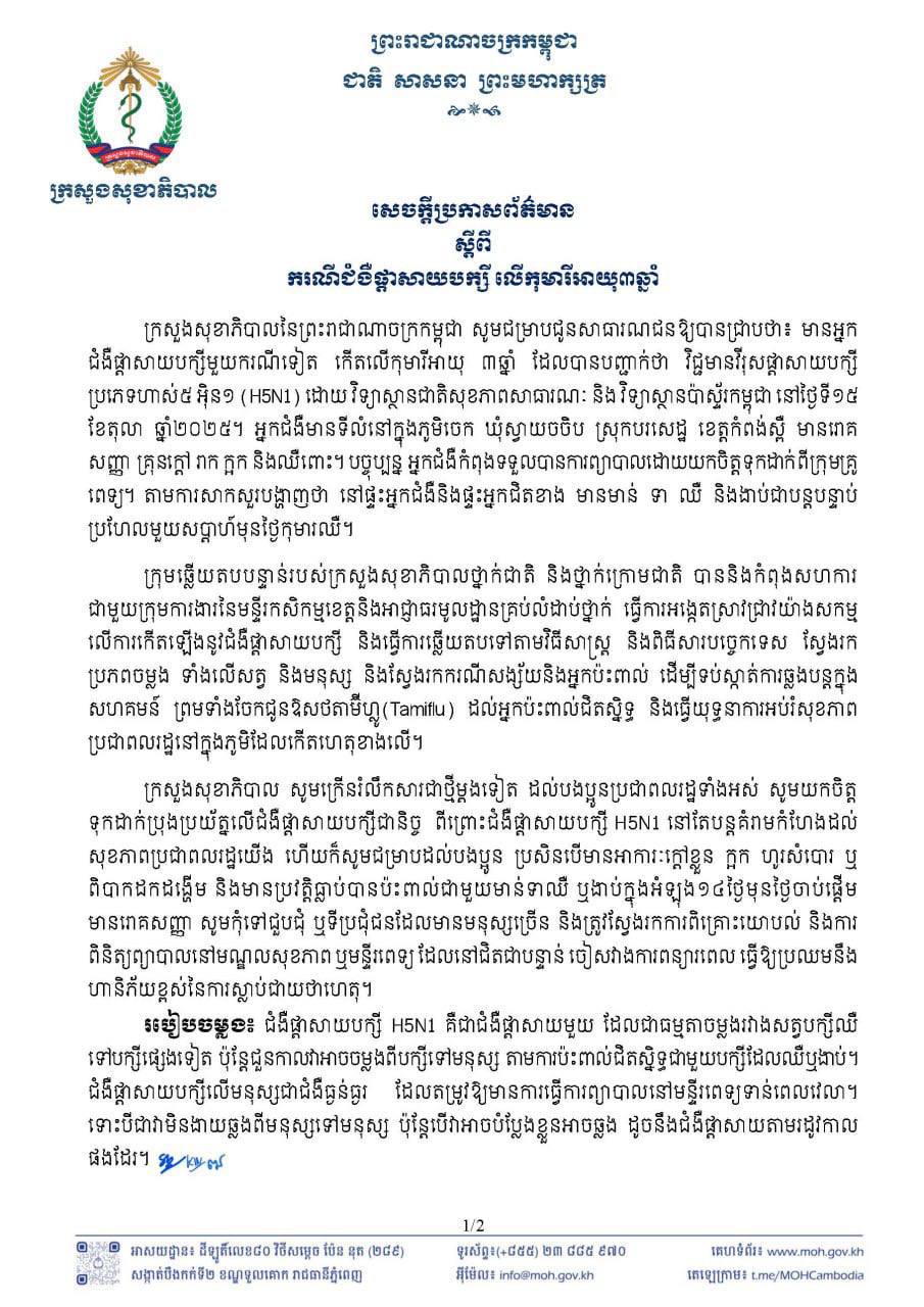 ភ្នំពេញ៖ ក្រសួងសុខាភិបាលនៃព្រះរាជាណាចក្រកម្ពុជា សូមជម្រាបជូនសាធារណជនឱ្យបានជ្រាបថា៖ មានអ្នក ជំងឺផ្តាសាយបក្សីមួយករណីទៀត កើតលើកុមារីអាយុ ៣ឆ្នាំ ដែលបានបញ្ជាក់ថា វិជ្ជមានវីរុសផ្តាសាយបក្សី ប្រភេទហាស់៥ អ៊ុន១ (H5N1) ដោយ វិទ្យាស្ថានជាតិសុខភាពសាធារណៈ និង វិទ្យាស្ថានប៉ាស្ទ័រកម្ពុជា នៅថ្ងៃទី១៥ ខែតុលា ឆ្នាំ២០២៥។ អ្នកជំងឺមានទីលំនៅក្នុងភូមិចេក ឃុំស្វាយចចិប ស្រុកបរសេដ្ឋ ខេត្តកំពង់ស្ពឺ មានរោគ សញ្ញា គ្រុនក្តៅ រាក ក្អក និងឈឺពោះ។ បច្ចុប្បន្ន អ្នកជំងឺកំពុងទទួលបានការព្យាបាលដោយយកចិត្តទុកដាក់ពីក្រុមគ្រូ ពេទ្យ។ តាមការសាកសួរបង្ហាញថា នៅផ្ទះអ្នកជំងឺនិងផ្ទះអ្នកជិតខាង មានមាន់ ទា ឈឺ និងងាប់ជាបន្តបន្ទាប់ ប្រហែលមួយសប្តាហ៍មុនថ្ងៃកុមារឈឺ។