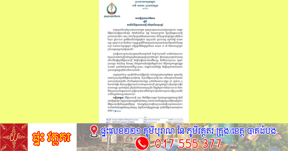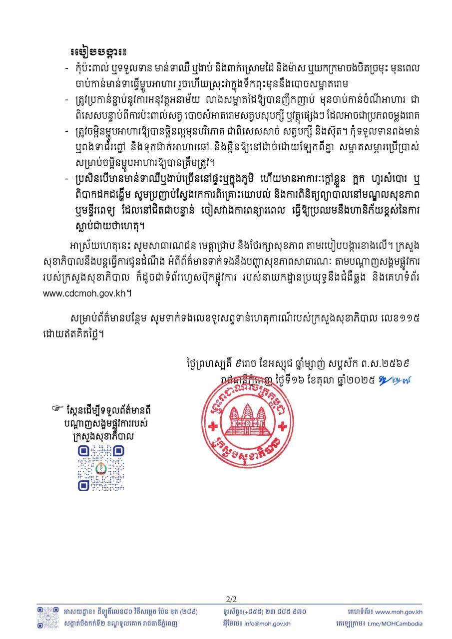 អាស្រ័យហេតុនេះ សូមសាធារណជន មេត្តាជ្រាប និងថែរក្សាសុខភាព តាមរបៀបបង្ការខាងលើ។ ក្រសួង សុខាភិបាលនឹងបន្តធ្វើការជូនដំណឹង អំពីព័ត៌មានទាក់ទងនឹងបញ្ហាសុខភាពសាធារណៈ តាមបណ្តាញសង្គមផ្លូវការ របស់ក្រសួងសុខាភិបាល ក៏ដូចជាទំព័រហ្វេសប៊ុកផ្លូវការ របស់នាយកដ្ឋានប្រយុទ្ធនឹងជំងឺឆ្លង និងគេហទំព័រ www.cdcmoh.gov.kh។