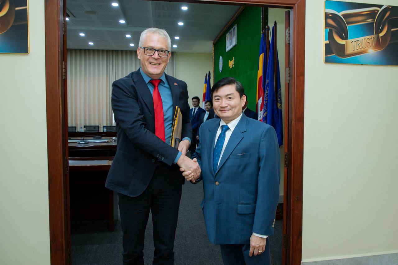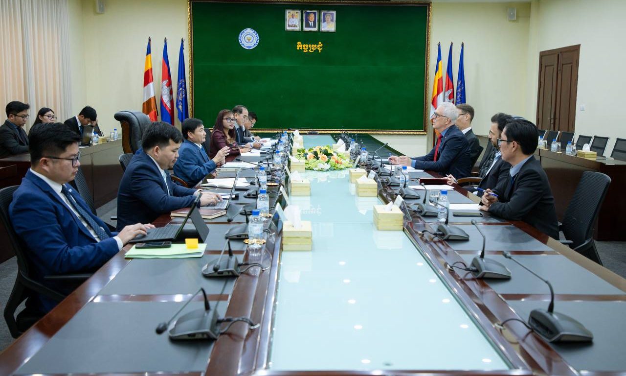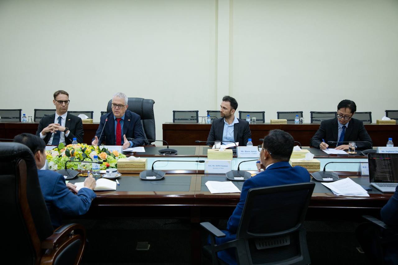 ភ្នំពេញ៖ លោក ហេង សួរ រដ្ឋមន្ត្រីក្រសួងការងារ និងបណ្តុះបណ្តាលវិជ្ជាជីវៈ បានទទួលជួបសម្តែងការគួរសម ជាមួយប្រតិភូទីភ្នាក់ងារកិច្ចសហប្រតិបត្តិការអាល្លឺម៉ង់ (GIZ) ដែលដឹកនាំដោយលោក Marcus Lange នាយកផ្នែកតំបន់អាស៊ីរបស់ GIZ និងមានការចូលរួមពីលោកបណ្ឌិត Matthias Bickel ដែលត្រូវបានតែងតាំងជាប្រធានថ្មី របស់ GIZ ប្រចាំប្រទេសកម្ពុជា នារសៀលថ្ងៃទី១៦ ខែតុលា ឆ្នាំ២០២៥ នៅទីស្តីការក្រសួងការងារ ដើម្បីពង្រឹងកិច្ចសហប្រតិបត្តិការរវាងស្ថាប័នទាំងពីរ ឱ្យកាន់តែស៊ីជម្រៅលើវិស័យការងារ សន្តិសុខសង្គម និងបណ្តុះបណ្តាលវិជ្ជាជីវៈ។