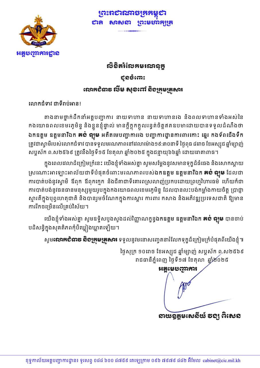 ភ្នំពេញ ៖ ឯកឧត្ដម នាយឧត្ដមសេនីយ៍ វង្ស ពិសេន អគ្គមេបញ្ជាការនៃកងយោធពលខេមរភូមិន្ទ ព្រមទាំងថ្នាក់ដឹកនាំ នាយទាហាន នាយទាហានរង និងពលទាហានទាំងអស់នៃកងយោធពលខេមរភូមិន្ទ ផ្ញើលិខិតរំលែកទុក្ខជូន លោកជំទាវ លីម សុខពៅ និងក្រុមគ្រួសារ ចំពោះមរណភាពឯកឧត្តម ឧត្តមនាវីឯក គង់ ឡុម អតីតមេបញ្ជាការរង បញ្ជាការដ្ឋានការពារកោះឆ្នេរ កងទ័ពជើងទឹក ដែលត្រូវជាស្វាមីរបស់លោកជំទាវ បានទទួលមរណភាពនៅវេលាម៉ោង១៩:៣០នាទី ថ្ងៃពុធ ៨រោច ខែអស្សុជ ឆ្នាំម្សាញ់ សប្តស័ក ព.ស២៥៦៩ ត្រូវនឹងថ្ងៃទី១៥ ខែតុលា ឆ្នាំ២០២៥ ក្នុងជន្មាយុ៦៦ឆ្នាំ ដោយរោគាពាធ។